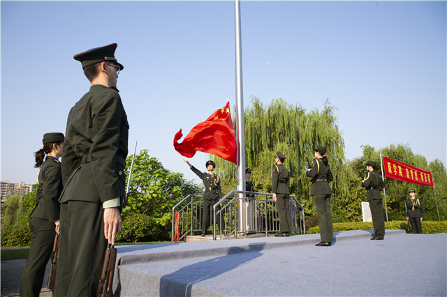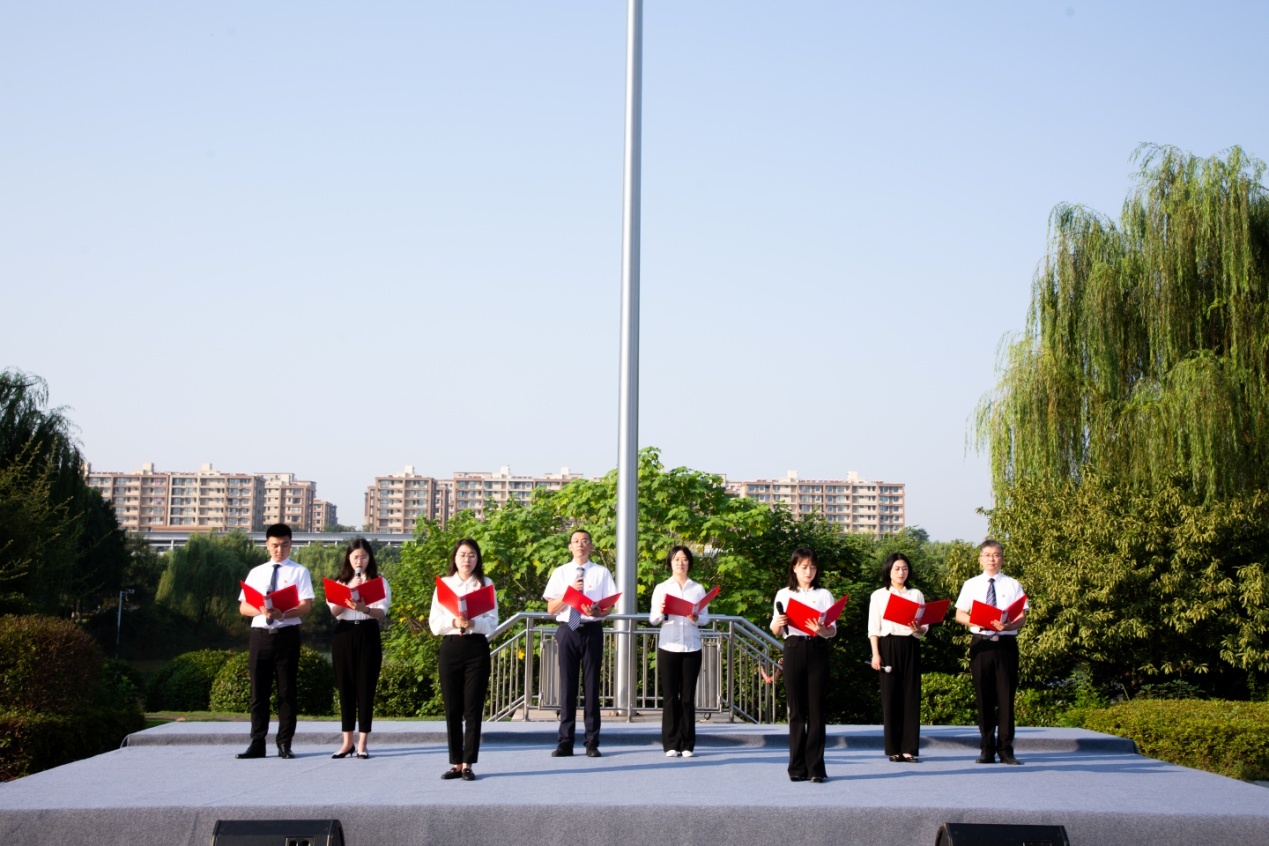 早上七點三十分,校國旗護衛隊邁著整齊的步伐入場,在雄壯的國歌聲中,五星紅旗徐徐升起,師生高唱國歌,向國旗注目,向祖國致敬。