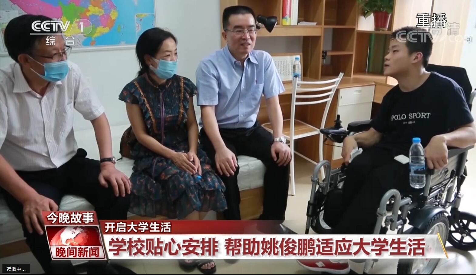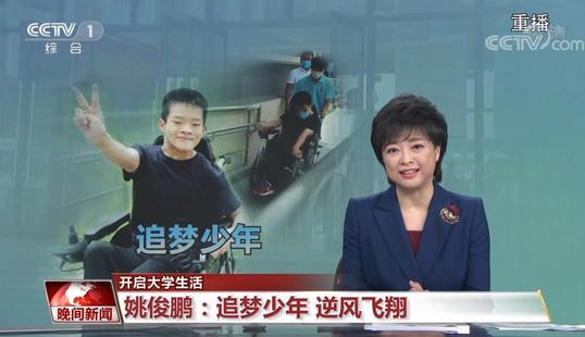 值得一提的是,9月13日晚10點,中央電視臺綜合頻道(CCTV-1)《晚間新聞》節目刊播了時長達3分38秒的人物通訊《開啟大學生活——姚俊鵬:追夢少年 逆風飛翔》。報道以“學校貼心安排,幫助姚俊鵬適應大學生活”和“個性化教學助力姚俊鵬學習和發展”為子標題,生動記錄了我校堅持育人為本的溫度和情懷,暖心打造無障礙單人宿舍,制定個性化學習幫扶方案,助力姚俊鵬“逆風飛翔”的溫情感人故事,讓人印象深刻。與此同時,中央電視臺新聞頻道(CCTV-13)在9月13日、14日的《新聞直播間》和《朝聞天下》欄目以不同視角、不同央視主持人口播等形式,對我校勵志腦癱少年姚俊鵬開啟大學新生活進行了6次播報。