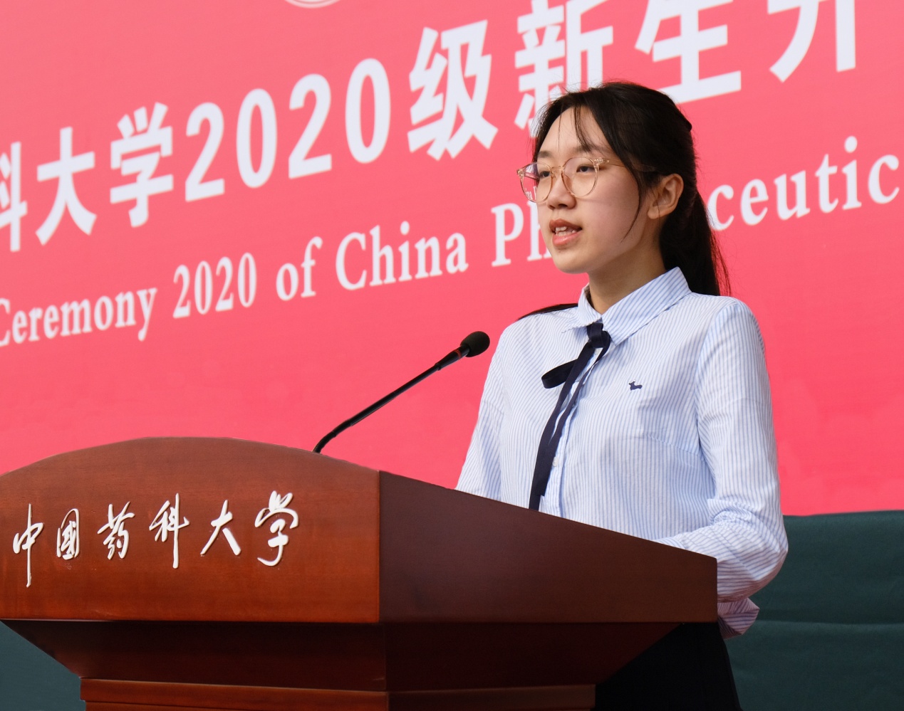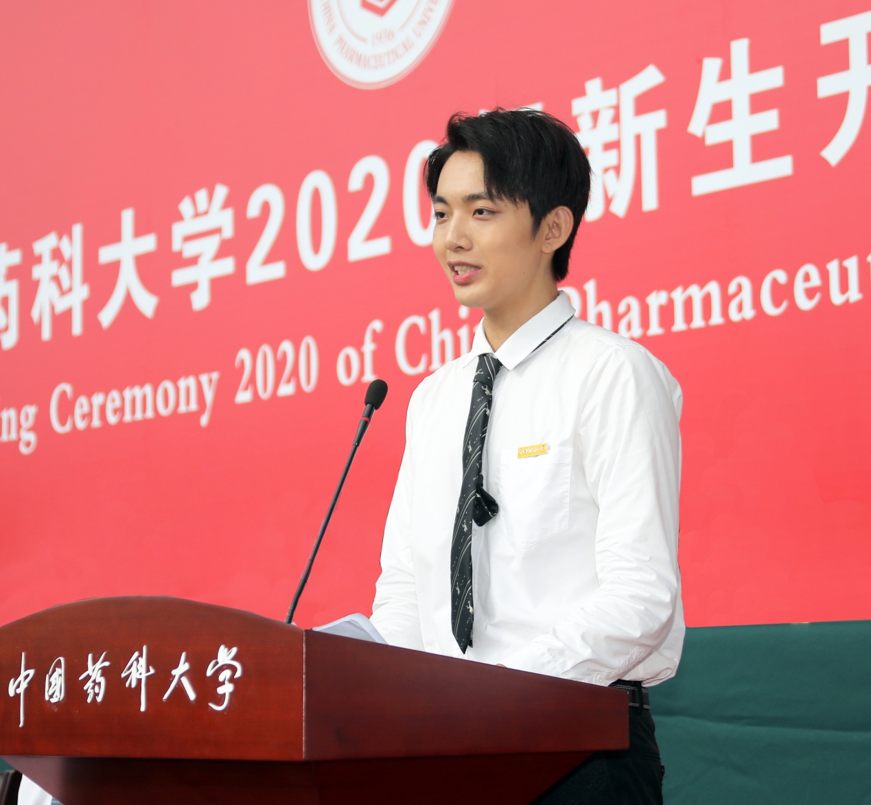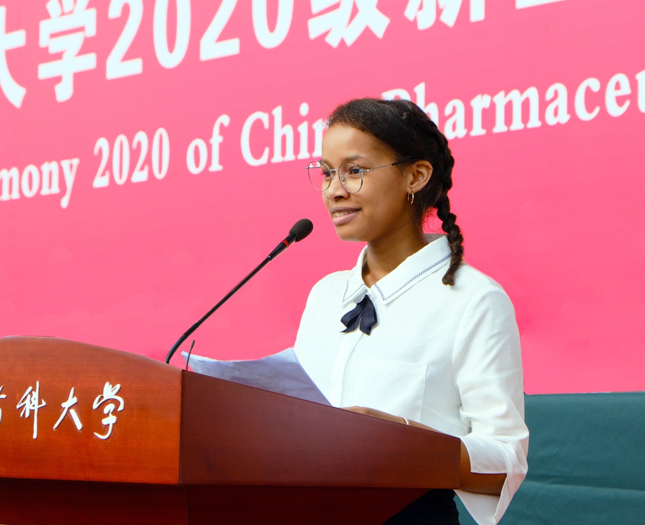 在莊嚴的國歌聲中,開學典禮正式拉開序幕。藥學院2020級本科生羅海珊,中藥學院2020級研究生王飛佐和來自馬達加斯加的查迪婭,分別代表本專科生、研究生和留學生新生發言。