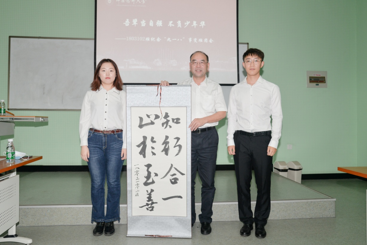 最后,學生代表向來校長送上了班級書法作品——班訓“知行合一,止于至善”,來校長也為每位同學贈送了“醉美藥大”金屬書簽,并拍下“全家福”留念。