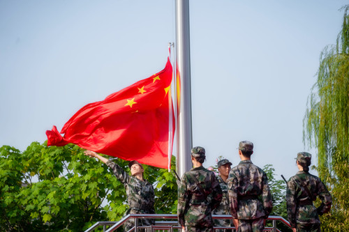 早上8時,校國旗護衛隊邁著整齊的步伐入場,在雄壯的國歌聲中,五星紅旗冉冉升起,現場師生高唱國歌,向國旗注目,向祖國致敬。
