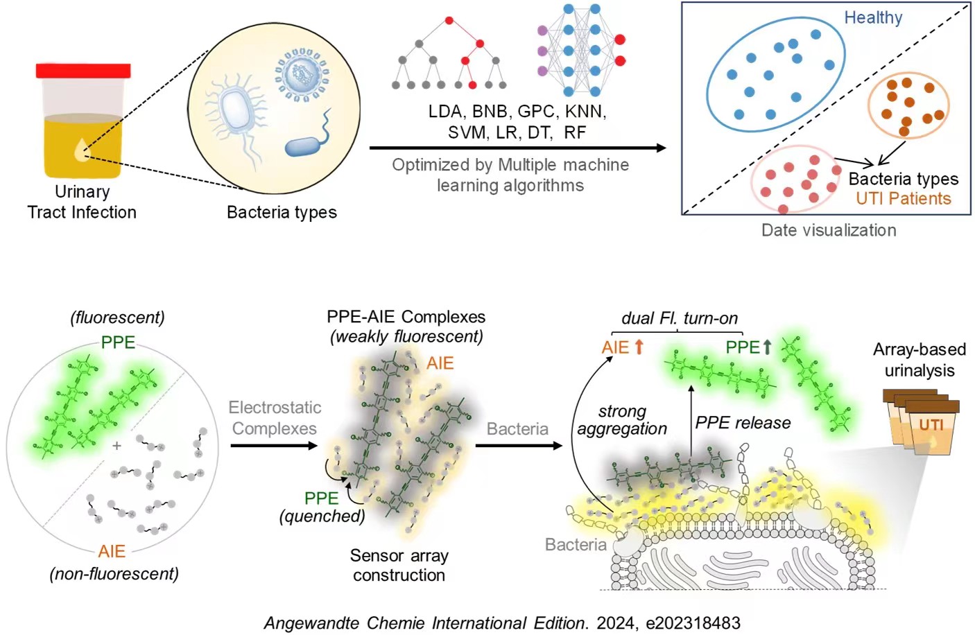 為解決這一問題,該團隊開發了一種基于“信號放大”效應的聚對苯乙炔(PPE)和多種帶正電荷的聚集誘導發光(AIE)染料構建的靜電復合物傳感器陣列。該傳感系統能夠對細菌產生雙通道熒光“turn-on”信號響應,實現了無需對樣本進行任何預處理情況下對低濃度(OD600 = 0.001)下20類細菌的并行檢測,以及細菌的定量檢測和混合細菌鑒定。結合多種人工智能機器學習算法優化,該傳感系統在無需對樣本進行預處理情況下,30秒內可實現對不同種類尿路感染臨床樣本的快速鑒定,極大地提高了檢測效率。該傳感器陣列結合了具有相反性質的兩類熒光染料,實現了信號放大,提升了檢測靈敏度,突破了臨床感染性疾病診斷中存在的“檢不出”、“檢不準”、“檢不廣”的技術瓶頸,展示了巨大的臨床應用潛力。未來團隊將進一步開發便攜式、智能化、多功能的并行檢測設備,推動這一技術的臨床轉化和應用。