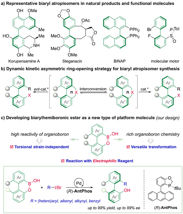 具有低阻轉能壘的環狀聯芳基試劑可在手性催化體系下發生動態動力學不對稱開環反應,為軸手性聯芳基骨架的不對稱合成提供了有效方法。然而,現有的環狀聯芳基試劑存在互補反應性缺失、結構類型受限、適用反應類型少等問題。針對這些問題,研究團隊通過有機硼酸與聯芳基骨架融合的策略,設計開發了一類聯芳基硼酸半酯試劑,該類試劑具有與現有試劑互補的反應特性,且在過渡金屬催化體系下展現出高反應活性,適用于多類型反應。在該項工作中,作者開發了聯芳基硼酸半酯的鈀催化動態動力學不對稱Suzuki?Miyaura偶聯反應,該反應具有條件溫和、反應高效、底物范圍廣、對映選擇性高等優點,為軸手性聯芳基結構的高效精準合成提供了一種有效方法。此外,反應機理研究表明,與傳統的經不對稱還原消除構建聯芳基軸手性不同,在該不對稱Suzuki?Miyaura偶聯反應中,阻轉選擇性的轉金屬化步驟決定了產物的對映選擇性,此發現進一步豐富了該諾獎反應的手性控制模式。