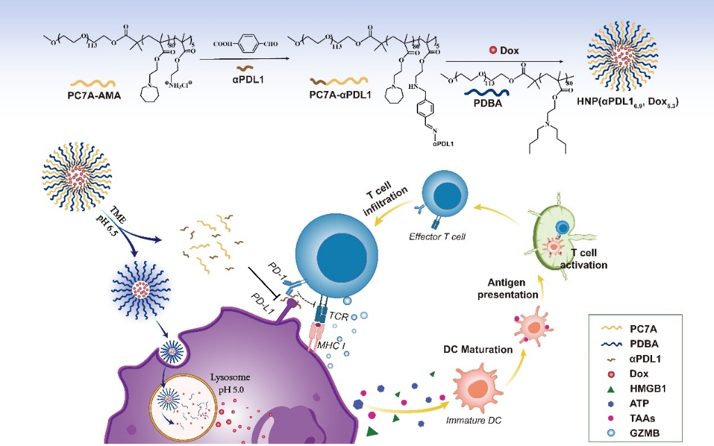 免疫檢查點抑制劑與化藥聯合已成為臨床治療腫瘤的一線方案,然而兩種藥物具有不同的空間作用位點需求:分別起效于腫瘤組織外液與腫瘤細胞內部。現有的多藥共遞送系統大多同時釋放荷載藥物,難以兼顧二者在空間水平最佳釋藥位點的平衡。該團隊利用兩種不同pKa的高分子聚合物作為載體,制備了pH逐級響應型釋藥遞送納米膠束平臺,并以αPDL1和Dox為模型藥物組合,驗證了其化療-免疫療法中的空間協同作用。