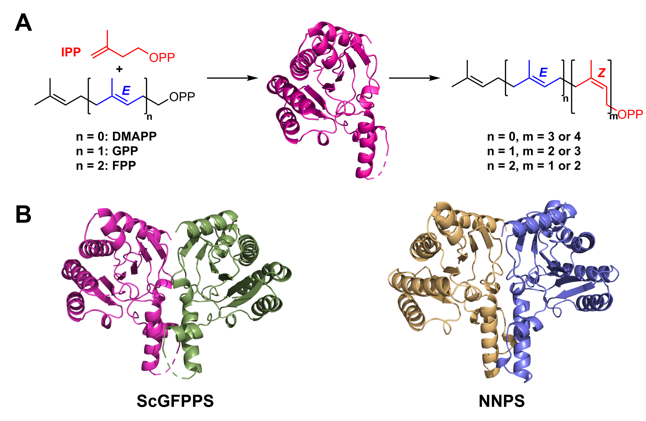 圖A:ScGFPPS的功能表征;圖B:ScGFPPS及NNPS的蛋白晶體結(jié)構(gòu)