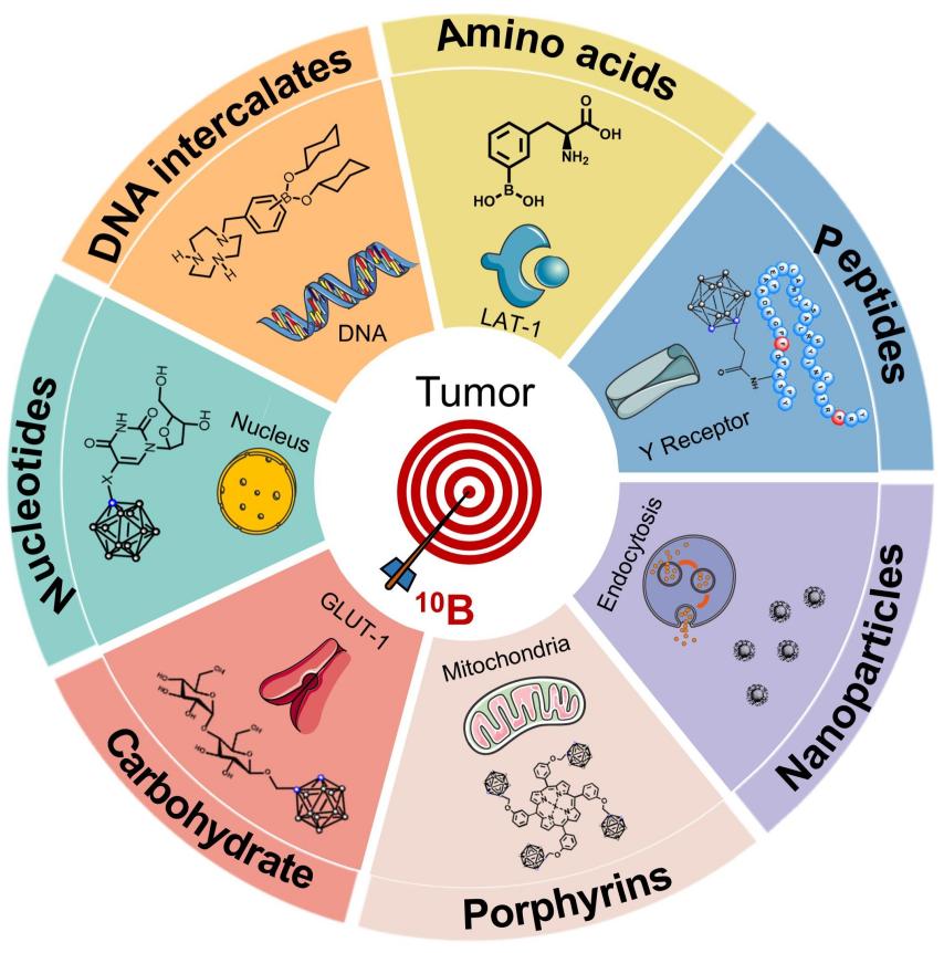 BNCT的臨床療效已在局部侵襲性腫瘤(腦膠質瘤,黑色素瘤,骨肉瘤等)中顯示出巨大潛力,其中一個關鍵技術是含硼藥物的研發。目前,BNCT中使用的主要硼攜帶劑是4-二羥基硼基-L型苯丙氨酸(L-10BPA)和Na210B12H11SH(BSH)。前者含硼量低,需要反復給藥,而后者缺乏腫瘤選擇性,產生較大副作用。該團隊就近十年來各種硼載體的研究現狀進行了綜述。這些載體可以根據不同的設計策略進行分類,包括細胞膜靶向(LAT、GLUT、多肽等),細胞核靶向(核酸衍生物、DNA嵌入劑)、增強滲透性和保留(EPR)效應(脂質體、聚合物、無機納米顆粒等。該綜述為具有應用前景的新型含硼制劑的研發提供了理論基礎,將推動這一技術的臨床轉化和應用。