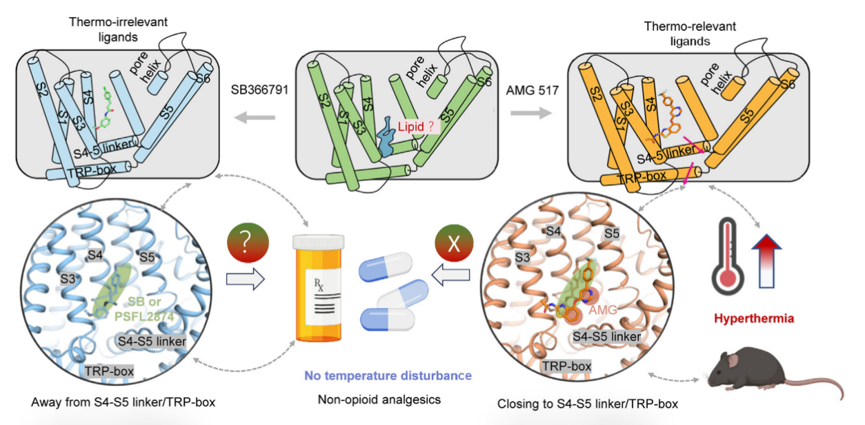 辣椒素(香草素)受體TRPV1是一種非選擇性陽離子通道。最初,David Julius教授在探索辣椒素引起痛覺的機(jī)制時(shí)發(fā)現(xiàn)了TRPV1。隨后,Julius教授在研究TRPV1如何感知熱量時(shí)意識到,TRPV1還是一種熱敏受體——在感受痛覺的溫度下,受體被激活。目前,多種TRPV1拮抗劑候選藥物進(jìn)入了臨床試驗(yàn)階段。不過,TRPV1激動劑/拮抗劑的研發(fā)面臨一大挑戰(zhàn),即它們往往會引起人體核心體溫的劇烈變化,這極大限制了相關(guān)藥物的使用可能性。至今,為何TRPV1靶向藥物在鎮(zhèn)痛的同時(shí)會引起核心體溫的劇烈變化,其中的分子機(jī)制尚不清楚。基臨院于燁教授領(lǐng)銜的膜生物物理與化學(xué)生物學(xué)課題組成員在《Neuron》上在線發(fā)表的題為“TRPV1 analgesics disturb core body temperature via a biased allosteric mechanism involving conformations distinct from that for nociception”論文為我們解答了這一問題。該項(xiàng)研究工作首次提出TRPV1中在同一位點(diǎn)結(jié)合不同配體的細(xì)微差別編碼了痛覺和體溫調(diào)節(jié)的功能。這一發(fā)現(xiàn)挑戰(zhàn)了將受體視為簡單開與關(guān)的傳統(tǒng)觀點(diǎn),并突出了通道蛋白也存在連續(xù)、偏好性信號編碼的受體復(fù)雜性,為研發(fā)TRPV1靶向且不改變體溫的非阿片類鎮(zhèn)痛藥物研發(fā)提供了扎實(shí)的基礎(chǔ)(圖2)。中國藥科大學(xué)博士生黃毅哲、博士后孫萌陽、碩士生馬靜嫻、博士生邊宇婧為本文的主要貢獻(xiàn)者。全文鏈接如下:https://doi.org/10.1016/j.neuron.2024.02.016