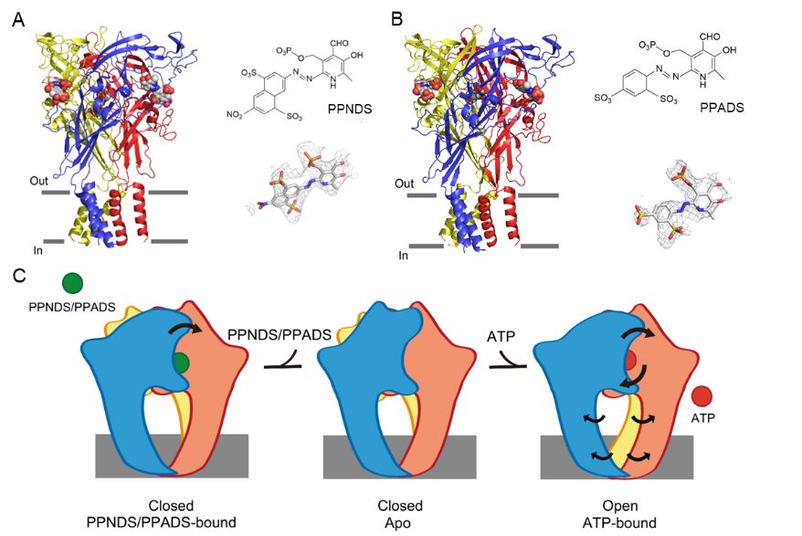 在P2X受體的調(diào)節(jié)機(jī)制方面,該團(tuán)隊(duì)同時(shí)與復(fù)旦大學(xué)服部素之團(tuán)隊(duì)聯(lián)合在《eLife》雜志在線發(fā)表題為“Structural insights into the orthosteric inhibition of P2X receptors by non-ATP-analog antagonists” 的文章,利用單顆粒冷凍電子顯微鏡技術(shù)結(jié)合電生理實(shí)驗(yàn),解析了P2X7受體與兩種磷酸吡哆醛衍生物的復(fù)合物結(jié)構(gòu),并分析了這兩種正構(gòu)拮抗劑對P2X7受體的調(diào)節(jié)作用和機(jī)制,為P2X7亞型特異的藥物設(shè)計(jì)提供結(jié)構(gòu)信息。參與本文的中國藥科大學(xué)的主要貢獻(xiàn)者為郭常潤副教授,中國藥科大學(xué)碩士研究生岳晨茜。全文鏈接如下:https://elifesciences.org/articles/92829