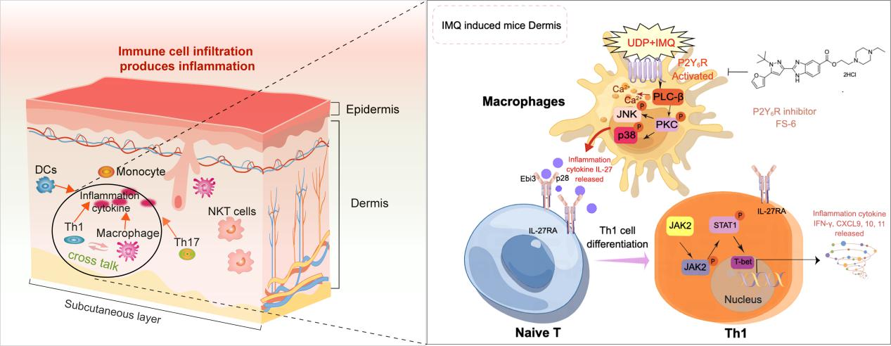 近日,醫學學科頂尖期刊Acta Pharmaceutica Sinica B(影響因子IF=14.7)在線發表了我校藥學院胡慶華/周夢澤團隊的最新研究成果“Macrophage P2Y6R activation aggravates psoriatic inflammation through IL-27-mediated Th1 responses”。藥學院博士尹力為本論文的第一作者,藥學院胡慶華教授、周夢澤助理研究員和蘇州大學李環球副教授為共同通訊作者,中國藥科大學為第一通訊單位。
