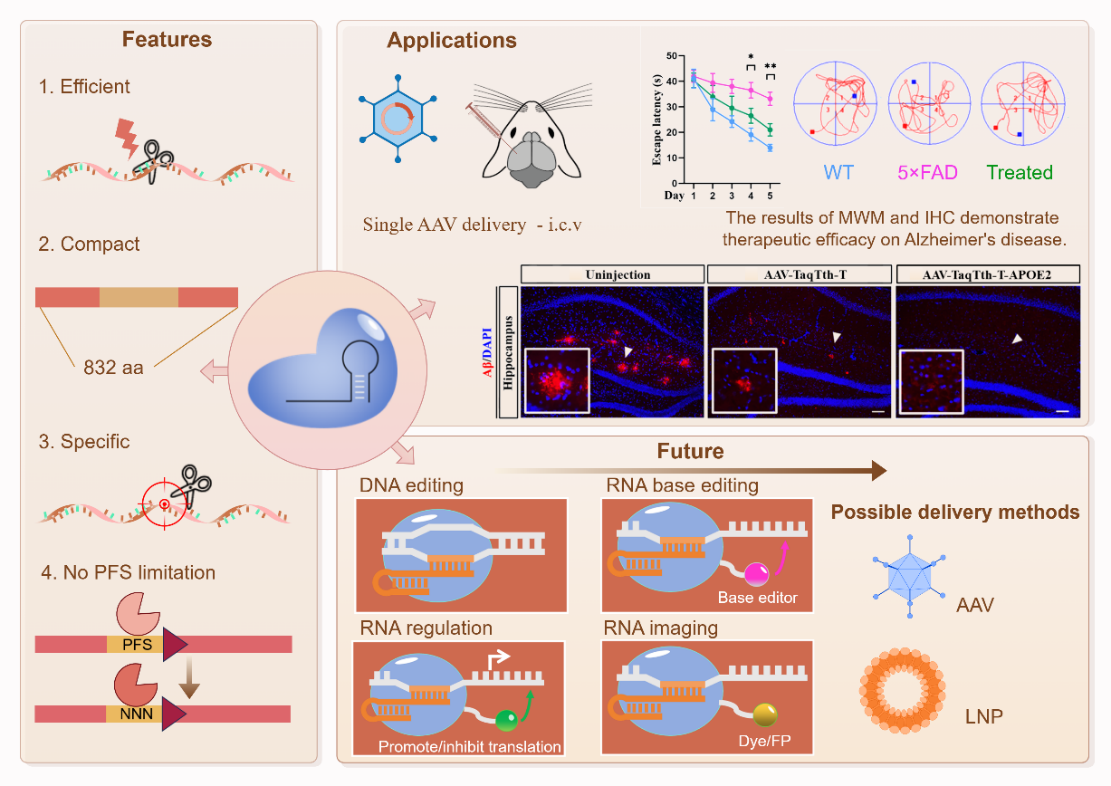 徐澍團(tuán)隊(duì)著手構(gòu)建了一種新型RNA編輯工具TaqTth-hpRNA,由向?qū)?/span>RNA探針(hpRNA)引導(dǎo)重組FEN1類功能蛋白(TaqTth,832aa),在靶標(biāo)RNA上進(jìn)行高特異性識(shí)別切割,無(wú)PFS固定堿基搭配模式要求。由于尺寸緊湊,AAV裝載后仍有充足空間,司馬健/徐翀團(tuán)隊(duì)提出在破壞“致病基因”APP的基礎(chǔ)上,可追加過(guò)表達(dá)一種“抗病基因”APOE2,用單一AAV裝載遞送,雙管齊下,組合治療AD。實(shí)驗(yàn)證明治療后的5×FAD小鼠的β淀粉樣蛋白水平顯著降低,行為學(xué)指標(biāo)、病理學(xué)指標(biāo)均有明顯改善。