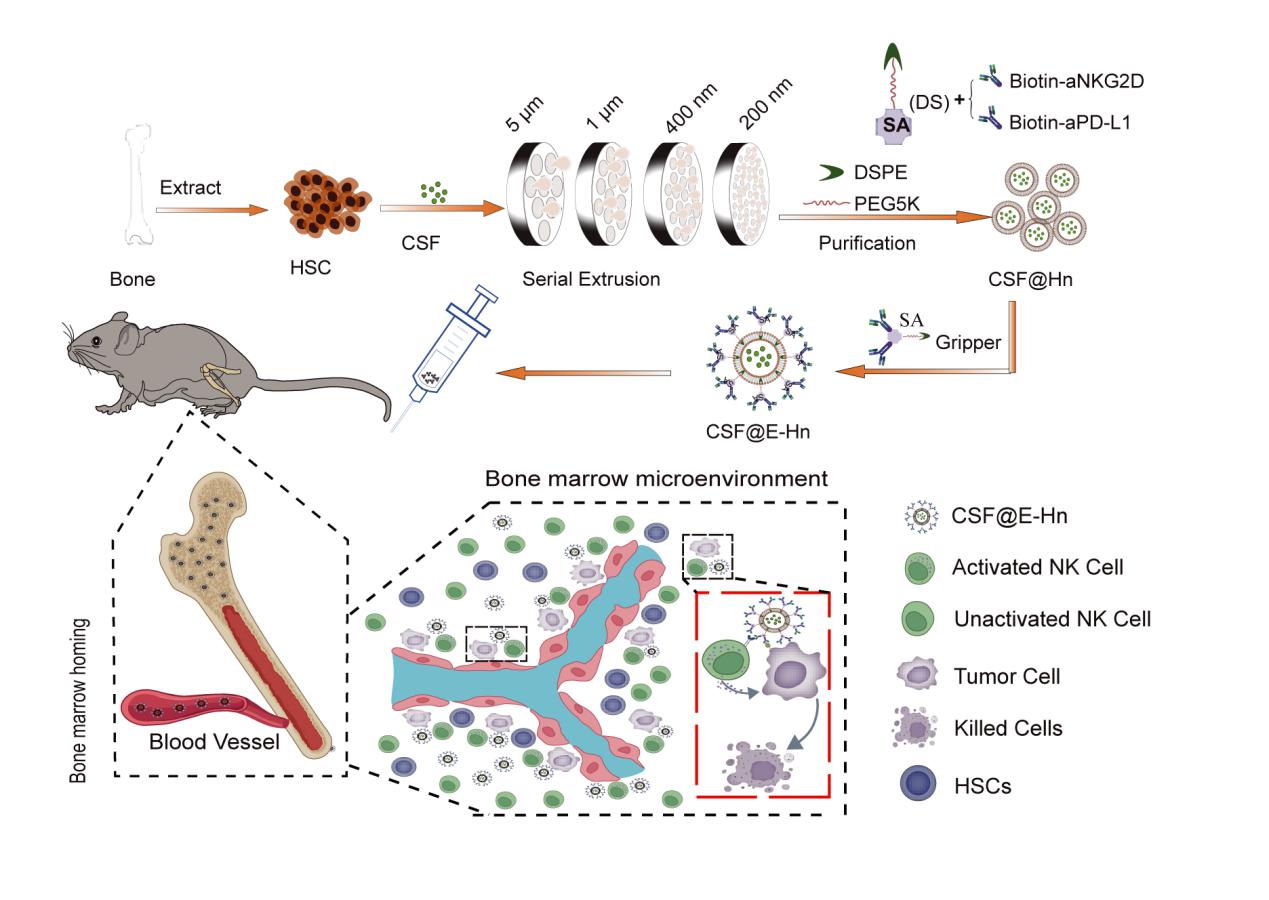 在這項研究中,研究人員報道了一種雙特異性納米囊泡載藥系統,以造血干細胞囊泡為骨髓靶向載體,通過對其進行雙配體(aPD-L1和aNKG2D)修飾和集落刺激因子(CSF)包載,實現了對骨髓內NK細胞和腫瘤細胞的雙特異性捕獲,在激活NK細胞的同時阻斷腫瘤細胞對NK細胞的抑制作用,從而促使NK細胞快速發揮腫瘤細胞殺傷效應。該雙特異性納米囊泡載藥系統不僅能夠充分治療急性髓細胞性白血病(AML)和多發性骨髓瘤(MM),還能夠有效地抑制腫瘤復發,兼具治療和預防的雙重作用,在血液惡性腫瘤的預防和治療中具有臨床應用前景。