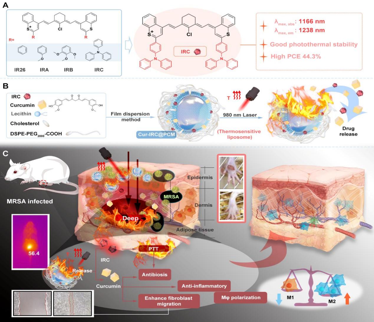 同期,袁振偉副教授團隊聯合廈門大學鄭錦榮研究員,通過對近紅外二區光熱劑IR 26進行結構修飾,合成了具有D-A-D結構的新型近紅外二區染料(IRC),并提高其光學性能。在IRC的特殊光熱特性的基礎上,加入了姜黃素,一種天然的傷口愈合化合物,以解決細菌感染和破壞糖尿病傷口中的巨噬細胞分化。最后利用相變材料(PCM)脂質體進行包封。在使用980 nm激光作用下,Cur-IRC@PCM NPs通過IRC誘導光熱效應,允許PCM脂質體達到其相變溫度并隨后釋放負載的藥物(姜黃素),協同PTT產生抗菌效果。它還促進傷口愈合。該策略通過實現PTT聯合抗菌藥物殺滅細菌的序貫治療效果,隨后程序化誘導M2極化,成功治療了MRSA感染的糖尿病傷口。該研究以題為“Development of D–A–D-Type NIR-II Photothermal Agents for Synergistic Eradication of Multidrug-Resistant Bacteria and Promoting Diabetic Wound Healing”發表在工科頂尖期刊Advanced Functional Materials上。工學院博士研究生劉季為論文第一作者,袁振偉副教授為論文通訊作者,中國藥科大學為第一通訊單位。