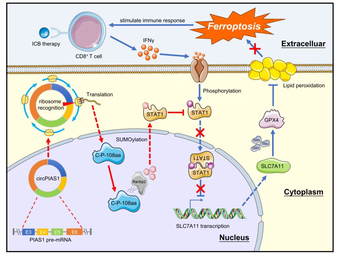 該團隊聚焦環狀RNA在癌癥進展中的作用,特別是發現了一種由核定位的circPIAS1編碼的長108aa的特殊多肽(circPIAS1-108aa)。研究表明,黑色素瘤細胞中的circPIAS1-108aa通過招募SUMO E3連接酶Ranbp2促進STAT1的SUMO化(K703,E705),進而抑制了STAT1的磷酸化(Y701),最終幫助癌細胞逃脫由IFNγ誘導的免疫性鐵死亡的影響。此外,特異性靶向circPIAS1的ASOs(反義寡核苷酸)與PD-1抑制劑聯合用藥可顯著抑制黑色素瘤的生長,大大提高了ICB療效。該研究重點發現了circPIAS1-108aa是限制惡性黑色素瘤免疫藥物治療的關鍵因素,也為改善ICB療法提出了一種前景廣闊的策略。