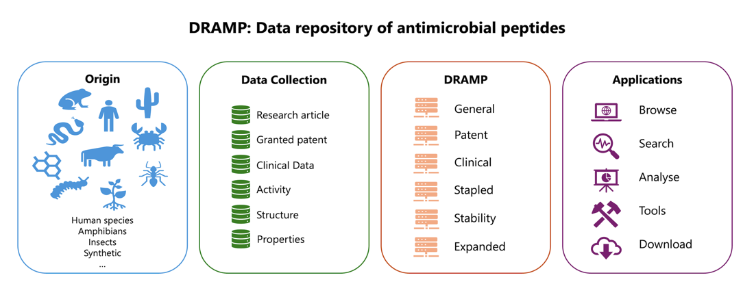 細菌耐藥性是當前全球公共衛生領域面臨的重要問題之一。抗菌肽具有廣譜抗菌活性,作用機制獨特,較難誘導耐藥,在耐藥細菌感染臨床上具有重要應用前景,但受限于穩定性、溶血性以及細胞毒性等性質,目前進入臨床研究的抗菌肽仍較少。DRAMP(Data repository of antimicrobial peptides, http://dramp.cpu-bioinfor.org/)第4版更新側重于抗菌肽的臨床轉化,首次添加了抗菌肽血清/蛋白酶半衰期穩定性數據,并補充了大量實驗測定的抗菌肽溶血/細胞毒性數據。除此以外,本次更新新增了8000多條抗菌肽條目,包括來自中文文獻的抗菌肽信息。這些信息和數據可以免費從數據庫的download界面下載,可用于促進人工智能輔助的抗菌藥物設計。