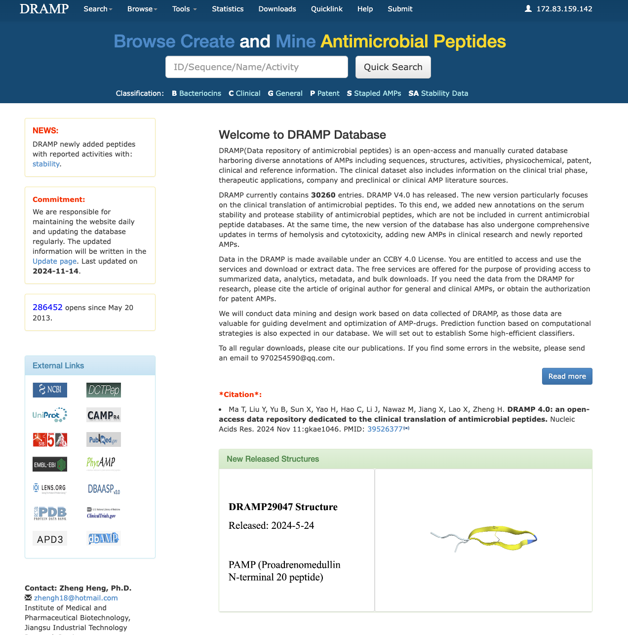 近日,生命科學學科頂尖期刊Nucleic Acids Research(IF=16.6)在線發表了我校生命科學與技術學院鄭珩課題組的最新研究成果:DRAMP 4.0: an open-access data repository dedicated to the clinical translation of antimicrobial peptides。我校碩士研究生馬天玥為論文第一作者,鄭珩副教授及勞興珍副教授為本文的共同通訊作者,中國藥科大學為本文的唯一通訊單位。