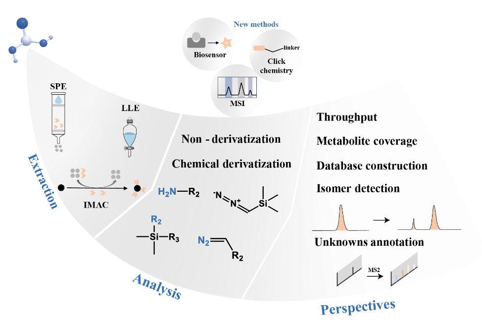 機體內超過1/3的代謝物為磷酸修飾代謝物,這些代謝物在功能上彼此關聯,共同構成磷酸修飾代謝網絡,實現磷酸修飾代謝物的定性和定量分析是探究磷酸修飾代謝網絡功能的前提和基礎。團隊系統梳理了目前磷酸修飾代謝物分析的樣本前處理方法、分析策略,強調了質譜探針對于建立該類代謝物定量分析方法的重要性,同時,提出了磷酸修飾代謝物的分析瓶頸問題及未來發展趨勢。相關內容以“Challenges and possibilities for the qualitative and quantitative analysis of phosphate metabolites”為題發表在TrAC Trends in Analytical Chemistry。藥學院張培副教授、2021級博士生高美玉為本文共同第一作者,許風國教授為通訊作者,中國藥科大學為唯一通訊單位。