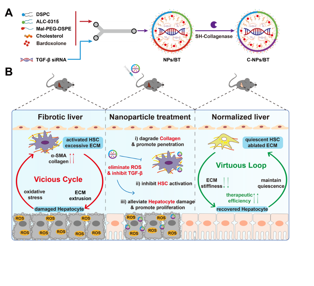 針對纖維化肝臟內“活化的肝星狀細胞-受損的肝實質細胞”相互作用構成惡性循環的病理特點,姜虎林教授團隊構建惡性循環逆轉型藥物遞送系統,抑制TGFβ信號通路和抗氧化應激,從而抑制肝星狀細胞活化并修復受損肝實質細胞,有效調控肝纖維化病理微環境。相關工作以“Pathological Microenvironment-Remodeling Nanoparticles to Alleviate Liver Fibrosis: Reversing Hepatocytes-Hepatic Stellate Cells Malignant Crosstalk’’為題發表在Advanced Science上。藥學院博士生張凌烽、碩士畢業生鄧文琦及王興歡為共同第一作者,姜虎林教授為本文唯一通訊作者,中國藥科大學為唯一通訊單位。