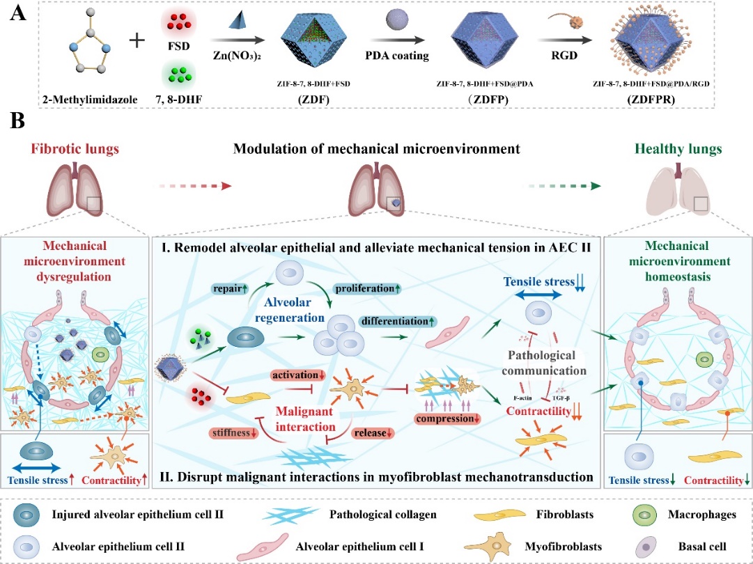 特發性肺纖維化是一種進行性且致命的肺部疾病,其進展受損傷性機械力的影響,最終破壞肺部機械微環境的穩態,導致肺泡功能障礙并進一步加重病情。由于纖維化肺部固有的機械敏感特性,II型肺泡上皮細胞會受到持續拉伸,過度活化的肌成纖維細胞在機械轉導過程中也會形成惡性互作。該研究團隊構建肺部靶向的納米遞送系統,一方面通過促進肺泡的修復和分化,有效降低了II型肺泡上皮細胞的機械張力;另一方面打破肌成纖維細胞收縮性與細胞外基質剛度之間的惡性循環,最終成功恢復肺部力學穩態,有效調控病理狀態下肺部異常的機械力水平。相關工作以“Modulating Fibrotic Mechanical Microenvironment for Idiopathic Pulmonary Fibrosis Therapy”為題發表在Advanced Materials上。延邊大學藥學院博士生李雪娜為第一作者,姜虎林教授為本文唯一通訊作者,中國藥科大學為唯一通訊單位。