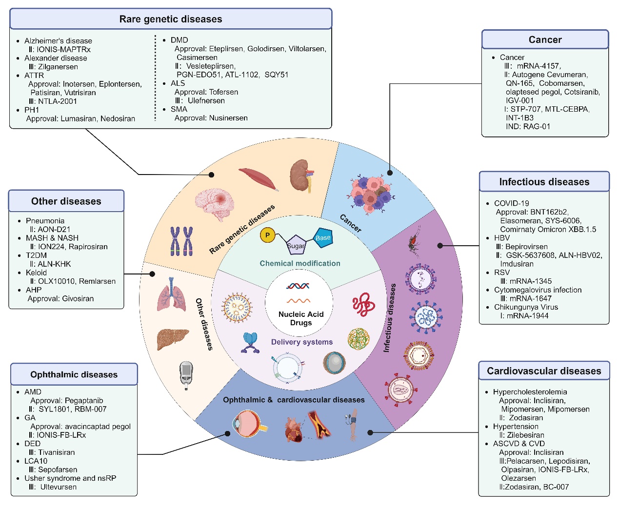 核酸藥物的臨床應用。多種核酸藥物被用于治療罕見遺傳病、癌癥、眼科疾病、心血管疾病和感染性疾病等,并展現出顯著的治療效果。