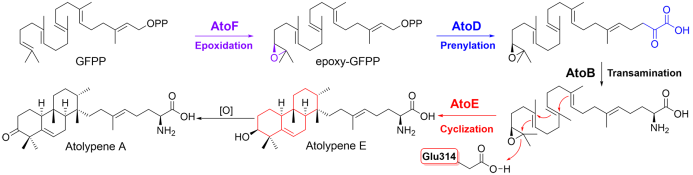 多氫菲雜萜類天然產(chǎn)物因其顯著生物活性在藥物開發(fā)中具有重要價值,但細菌來源的雜萜相對稀少,其生物合成機制尚未充分解析。課題組通過多學(xué)科交叉手段,首次揭示了細菌雜萜atolypenes碳環(huán)骨架的三步合成新路徑:環(huán)氧化、異戊烯基化和環(huán)化,這顯著區(qū)別于已知的真菌雜萜合成方式。研究還闡明了非典型II型萜烯合酶AtoE的催化機制,并通過生物信息學(xué)分析發(fā)現(xiàn)此類萜烯合酶在細菌基因組中普遍存在,提示了細菌生產(chǎn)多樣化雜萜類天然產(chǎn)物的潛力。我校2024屆博士畢業(yè)生王增援為論文獨立第一作者,董廖斌教授為唯一通訊作者。