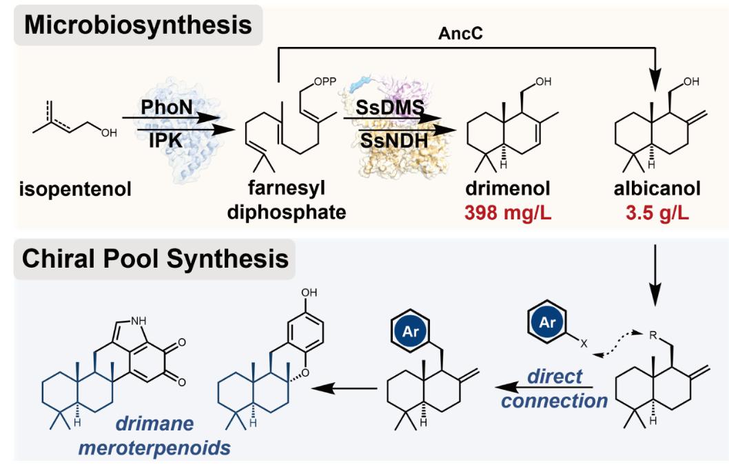 Drimane型雜萜天然產(chǎn)物是一類具有重要藥用價值的天然產(chǎn)物,但其生產(chǎn)長期面臨重大挑戰(zhàn)。針對這一難題,課題組開發(fā)了一套化學(xué)酶法合成新策略,通過優(yōu)化高產(chǎn)萜類的PhoN-IPK系統(tǒng)并引入Nudix水解酶,成功將drimenol產(chǎn)量提升至398 mg/L,albicanol產(chǎn)量在發(fā)酵罐中達到3.5 g/L,較此前提高千倍。研究團隊進一步以albicanol為起始原料,高效合成了多個具有生物活性的drimane型雜萜天然產(chǎn)物。與傳統(tǒng)合成路徑相比,該化學(xué)酶法不僅顯著減少了合成步驟,還大大提高了原子經(jīng)濟性。這一突破為drimane型雜萜天然產(chǎn)物的規(guī)模化生產(chǎn)和應(yīng)用開辟了新途徑。2023屆碩士畢業(yè)生杜雯煜、復(fù)旦大學(xué)程中玉博士生及中藥學(xué)院2022級博士研究生潘興明為共同第一作者,董廖斌教授和復(fù)旦大學(xué)李付琸教授為共同通訊作者。