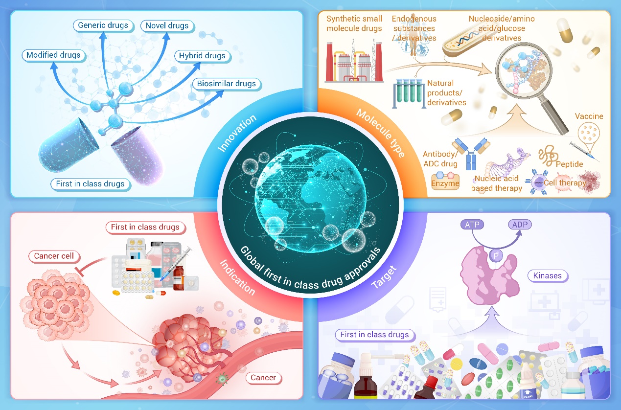 近日,我校藥學(xué)院王磊/尤啟冬團(tuán)隊(duì)在知名學(xué)術(shù)期刊The Innovation上在線發(fā)表了題為“Global first-in-class drugs approved in 2023-2024: Breakthroughs and insights” 的綜述文章,闡述了2023-2024年間全球首創(chuàng)性小分子藥物的突破與進(jìn)展。藥學(xué)院2024級(jí)直博生翟代超、副教授張秋月為本文的共同第一作者;藥學(xué)院藥物化學(xué)系王磊研究員、尤啟冬教授,海軍軍醫(yī)大學(xué)基礎(chǔ)醫(yī)學(xué)院盧小玲教授為本文共同通訊作者;中國(guó)藥科大學(xué)為本論文的第一通訊單位。