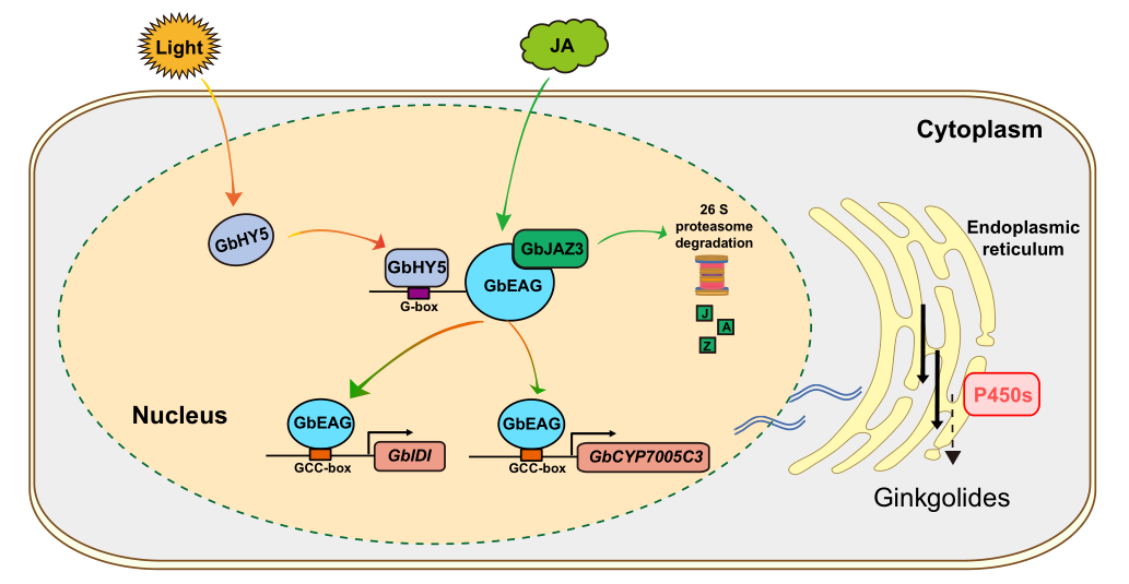 團隊研究鑒定了一個由AP2/ERF類轉錄因子GbEAG及其互作蛋白JA信號成員GbJAZ3和光信號成員GbHY5三者組成的分子模塊,作為銀杏內酯生物合成的關鍵調控樞紐。通過系統解析,作者發現這些蛋白通過整合組織特異性JA與光信號,激活銀杏內酯生物合成途徑基因,從而協同調控銀杏根中銀杏內酯的生成。這一發現不僅為通過分子育種及基因編輯技術提升銀杏內酯含量,進而防治心腦血管疾病提供了堅實的理論基礎,同時也為解析環境因素與激素信號相互作用在中藥材道地性形成過程中的機制提供了重要證據。