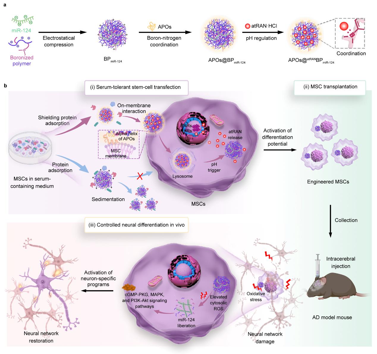 研究團隊通過解析蛋白冠功能組分、引入APOs修飾,開發了一種兼具血清耐受性與膜親和性的干細胞轉染納米系統(APOs@BP),成功實現了在含血清培養條件下安全、高效的干細胞轉染。基于此,針對干細胞神經分化時序調控需求,共載促分化劑全反式維甲酸衍生物和內源神經源性關鍵因子miR-124,利用pH/ROS響應性時序釋放機制,依次激活MSCs分化潛能與神經發生通路,穩控指導干細胞在體內外的高效分化,重塑腦內神經環路,為AD等中樞系統疾病治療提供了新思路和新方案。