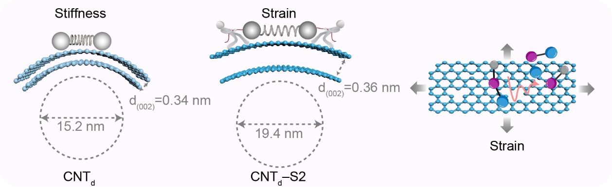 水體中藥物等新污染殘留造成了全球性的環境污染問題,引起了國家高度重視。在非均相高級氧化技術中,碳納米管(CNT)改性策略有助于提升水體修復過程中的催化性能。受此啟發,該研究首次揭示了應變缺陷位點對氯化反應的調控作用。研究發現,拉伸應變的sp2雜化C-C鍵缺陷位點顯示出更強的自旋-晶格弛豫,與自由氯分子通過初始的Yeager型吸附,從而產生強化的電子交互性,可以顯著提高氯化過程中對活性物種的析出與調控能力。實驗結果表明,高選擇性ClO?的比例從傳統基于缺陷體系中的38.8%提升至由應變主導的87.5%,有效促進了2,4-二氯苯酚(2,4-DCP)的無害中間體生成以及深度礦化。這項研究結果揭示了應變效應在水體藥物降解過程中的關鍵作用。