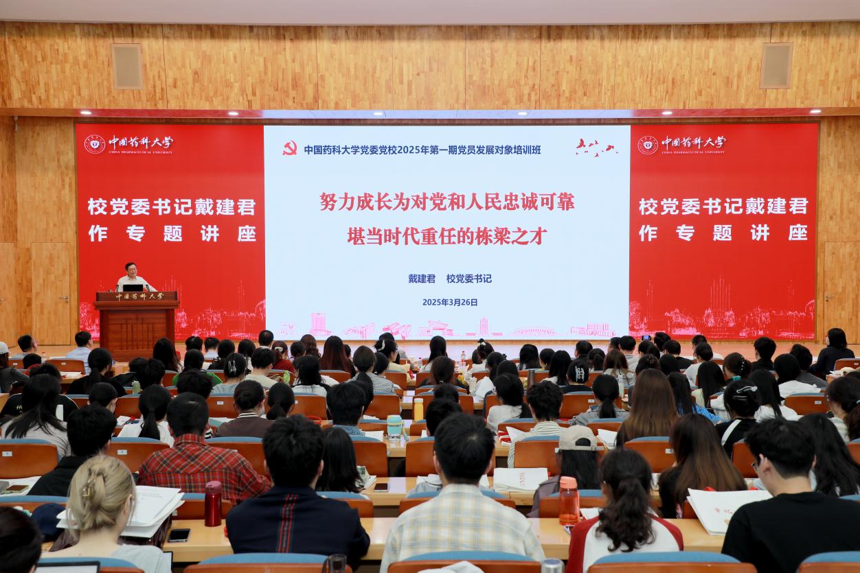 開班式在莊嚴的國歌聲中拉開序幕。圍繞“淬煉初心”“永葆忠誠”“堪當重任”等三個方面,戴建君作了題為《努力成長為對黨和人民忠誠可靠堪當時代重任的棟梁之才》的專題講座。他以宋慶齡先生矢志入黨的故事開篇,強調當代青年要從入黨是信仰的終身契約、思想的主動覺醒、成長的終身修煉三方面端正入黨動機,切實解決“思想入黨”的根本問題。隨后,他從“忠誠于黨、忠誠于人民、忠誠于馬克思主義”三個維度,對“忠誠”的核心要義進行了深入闡述,要求學員將服務人民健康需求作為檢驗忠誠的實踐標尺。戴建君強調,藥學青年擔當時代重任的主戰場是推進“健康中國”建設,要始終牢記和踐行習近平總書記對廣大青年“立大志、明大德、成大才、擔大任”的殷切寄語,切實擔負起“精業濟群”的神圣使命,關愛生命、護佑生靈,把握當前生物醫藥發展機遇,在推進中國式現代化的征程中書寫中國藥大青年的奮斗答卷。