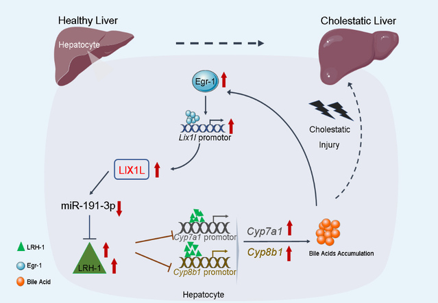 該團(tuán)隊發(fā)現(xiàn),LIX1L在原發(fā)性膽汁性膽管炎(PBC)與原發(fā)性硬化性膽管炎(PSC)病人、膽汁淤積動物模型的肝臟中表達(dá)量都顯著上調(diào),同時膽汁酸刺激的原代小鼠肝細(xì)胞中LIX1L表達(dá)量也增加。該團(tuán)隊發(fā)現(xiàn)膽汁酸代謝混亂引起的轉(zhuǎn)錄激活因子Egr-1促進(jìn)了LIX1L的高表達(dá)。LIX1L缺乏顯著降低了BDL和Mdr2-/-小鼠膽汁酸積累,緩解了肝臟炎癥、損傷和膽管周圍纖維化水平。進(jìn)一步發(fā)現(xiàn)LIX1L可通過miR-191-3p促進(jìn)LRH-1表達(dá),從而上調(diào)膽汁酸合成關(guān)鍵酶Cyp7a1和Cyp8b1的表達(dá)水平。在肝臟中過表達(dá)miR-191-3p對Mdr2-/-小鼠的膽汁淤積性肝損傷有保護(hù)作用。