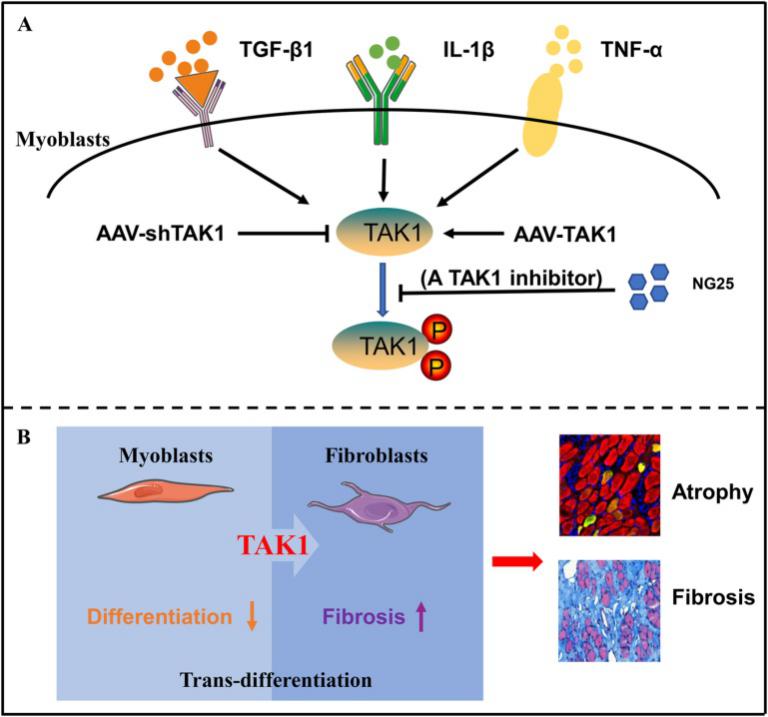抑制TAK1改善Duchenne肌營養不良小鼠成肌細胞分化和減輕纖維化機制示意圖