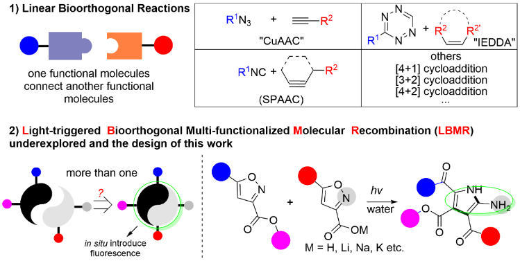 針對上述挑戰,研究團隊創新性地開發了一種全新的光促進生物正交反應(Light-Promoted Bioorthogonal Reaction via Molecular Recombination, 簡稱 LBMR)。該反應中異噁唑-3-甲酸酯類底物和異噁唑-3-甲酸或其鹽類為底物,在類生物兼容體系中可高效生成多取代吡咯衍生物。該反應過程涉及光誘導的分子重排和重組,具有反應條件溫和、動力學快速、對活性小分子無干擾等優點,展現出良好的底物兼容性與生物體系適應性。