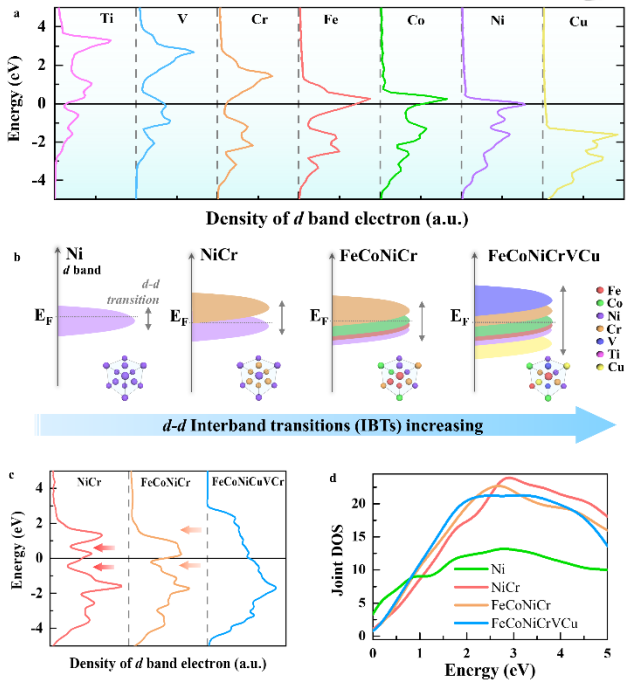光熱轉換材料是把吸收的光能轉變為熱能的一類材料,在光熱治療,太陽能利用等諸多領域起著至關重要的作用。基于局域等激元共振效應,金屬納米顆粒,比如Au,Ag等,是最受關注的光熱轉換材料,但是由于等離激元共振范圍有限,難以賦予材料在紫外到紅外的波段內都具有優異的光吸收性能,而且價格昂貴,在太陽能光熱利用方面存在很大的局限。徐波副教授根據帶間躍遷機制可以發生在很寬的光譜范圍內,并基于d電子非常局域的特點,首次提出如果能夠在材料費米能級上下4 eV區間內都填充上合適的3d電子,該材料將會具有在很寬的波段范圍內具有優異的光吸收性能。通過理論計算發現,3d過渡金屬高熵合金是符合這一要求的完美材料體系。徐波副教授和東北大學/杭州電子科技大學張雪峰教授實驗團隊合作,成功制備了多組元3d 過渡金屬高熵合金納米顆粒,驗證了其在200 ~2500 nm范圍內優異的光吸收性能,并且把該材料應用于太陽能水蒸發,發現基于該機制的水的蒸發速率要高于其他材料的實驗報道。此工作為設計新型,能夠在很寬波段范圍內都具有優異光吸收性能的光熱材料提供了新的思路。