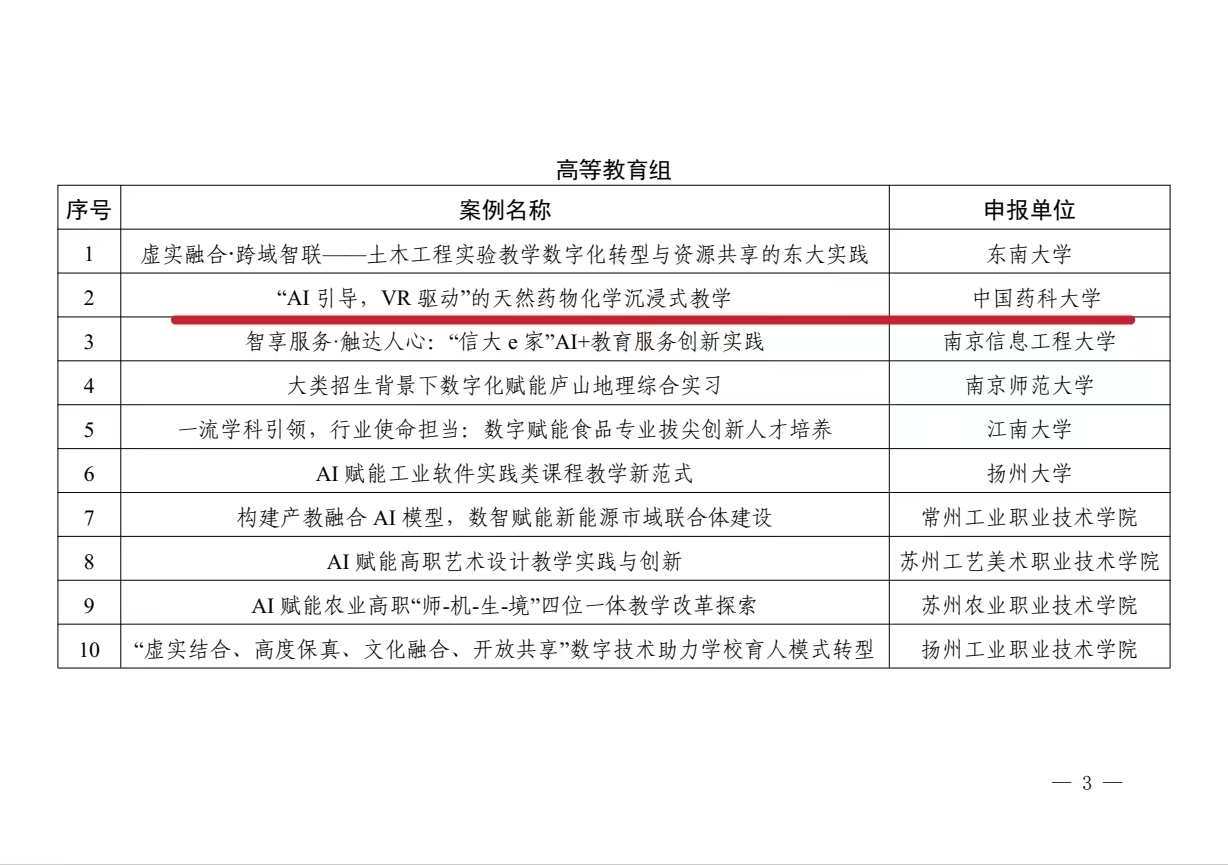 近日,江蘇省教育網絡安全和信息化領導小組辦公室正式公布2024年度全省教育數字化創新案例遴選結果,由我校申報、中藥學院孫建博老師牽頭負責的《“AI引導,VR驅動”的天然藥物化學沉浸式教學》案例成功入選。