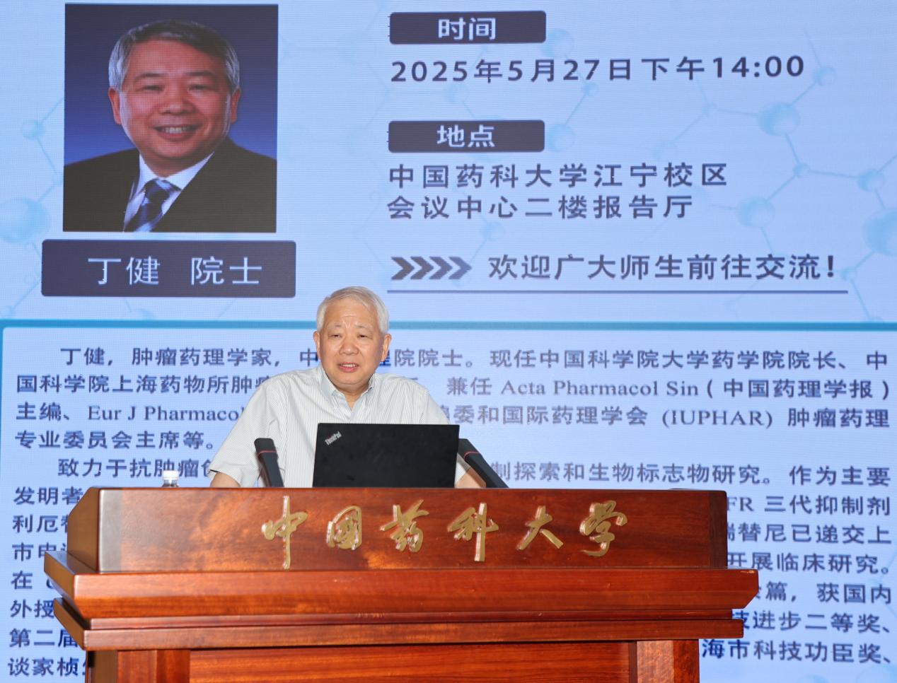 5月27日,多靶標天然藥物全國重點實驗室“國鈞講壇”學術前沿第八講報告在我校江寧校區會議中心報告廳舉行。中國工程院院士、中國科學院大學藥學院院長丁健應邀作專題報告。校長郝海平,中國工程院院士王廣基,全國重點實驗室主任李萍、黨委書記楊華以及學校相關職能部門負責人、師生代表等200余人參加報告會。