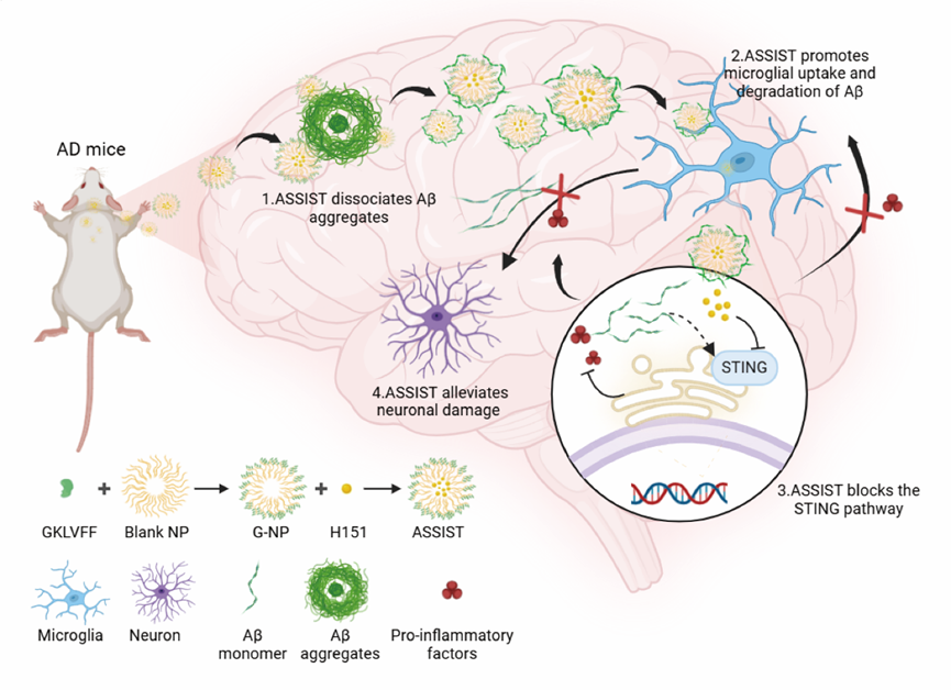 基于上述發(fā)現(xiàn),團(tuán)隊提出一種Aβ-STING 協(xié)同免疫抑制療法ASSIST(Aβ-STING Synergistic ImmunoSilencing Therapy)。其為一種可跨血腦屏障的納米膠束制劑,競爭性地解聚 Aβ 斑塊并防止再聚集,從而攜帶Aβ以低聚態(tài)的形式選擇性地被小膠質(zhì)細(xì)胞而非神經(jīng)細(xì)胞吞噬;進(jìn)入小膠質(zhì)細(xì)胞后,釋放STING抑制劑,阻斷炎癥信號,恢復(fù)Aβ清除的功能,并減少神經(jīng)元損傷,協(xié)同改善認(rèn)知障礙。