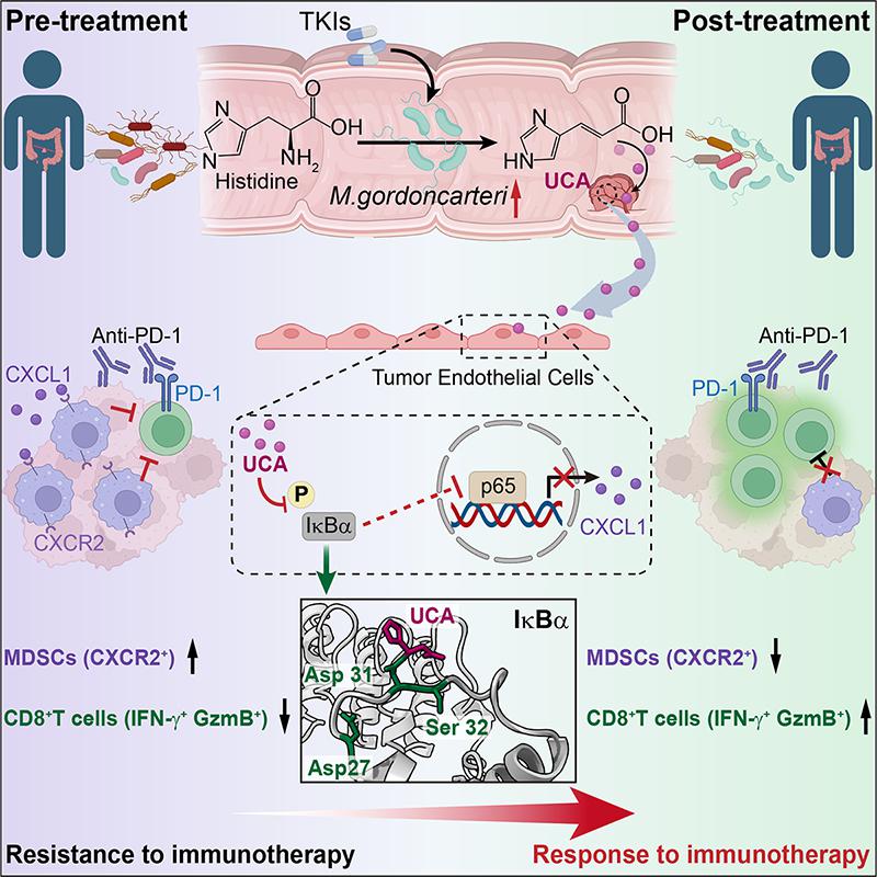 鑒于TKIs為口服藥物,在體內必然會與腸道菌群發生相互作用。團隊基于藥物體內過程檢測方法,發現腸道內TKIs通過增加Muribaculum gordoncarteri及其次生代謝物Urocanic acid(UCA)的水平,進而增強ICI療效。具體而言,UCA可與IκBα發生共價結合,從而抑制NF-κB通路的活化。這一過程進一步導致腫瘤血管內皮細胞中CXCL1表達減少,最終抑制了由CXCL1-CXCR2軸介導的髓系來源抑制細胞(Myeloid-derived suppressor cell,MDSC)的招募。綜上所述,該研究闡明了TKIs驅動腸道菌群代謝,助攻ICI療效的新機制,也揭示了UCA和M. gordoncarteri可作為ICI響應性的生物標志物。