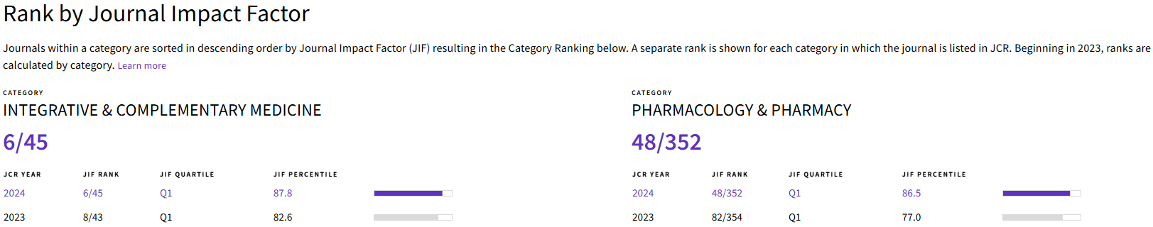據(jù)科睿唯安6月18日發(fā)布的2024《期刊引證報(bào)告》(JCR)顯示,我校主辦期刊《中國天然藥物》(CJNM)2024年SCI影響因子達(dá)到4.9,和去年相比增長23%,在SCI整合替代醫(yī)學(xué)學(xué)科(INTEGRATIVE & COMPLEMENTARY MEDICINE)的45種期刊中居第6位,藥理學(xué)/藥學(xué)學(xué)科(PHARMACOLOGY & PHARMACY)的352種期刊中居第48位,位于兩個(gè)學(xué)科雙Q1區(qū)。