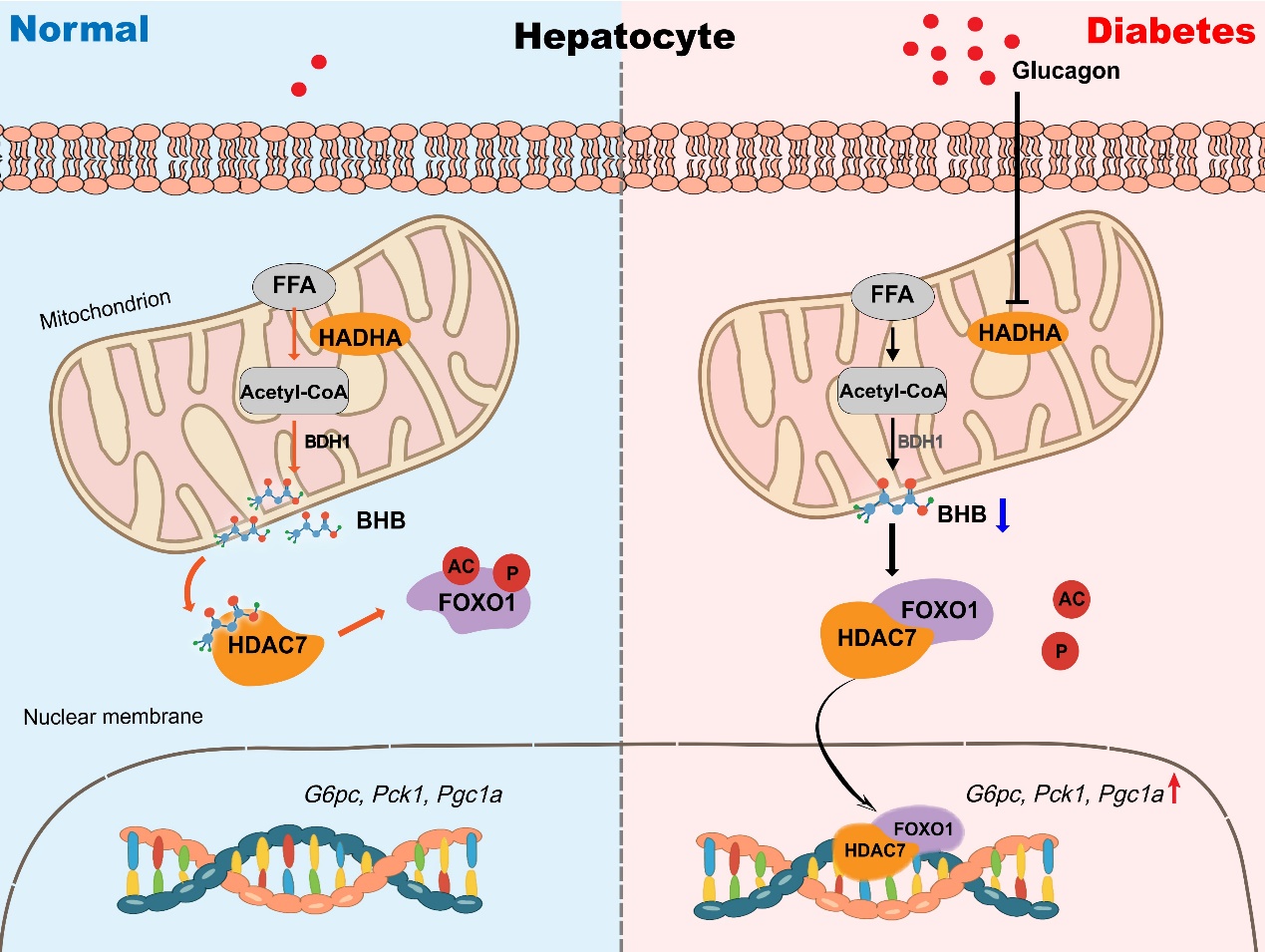 該研究的主要創新點在于發現HADHA是肝臟糖異生紊亂的關鍵抑制分子,其作用依賴于酮體 β-羥基丁酸的產生;β-羥基丁酸通過選擇性結合HDAC7(Glu543)抑制FOXO1轉錄活性,是肝糖異生的負調控代謝分子。該研究揭示了線粒體脂肪酸氧化酶HADHA以及酮體 β-羥基丁酸抑制肝臟糖異生紊亂的作用機制,為糖尿病的防治提供了潛在干預途徑。