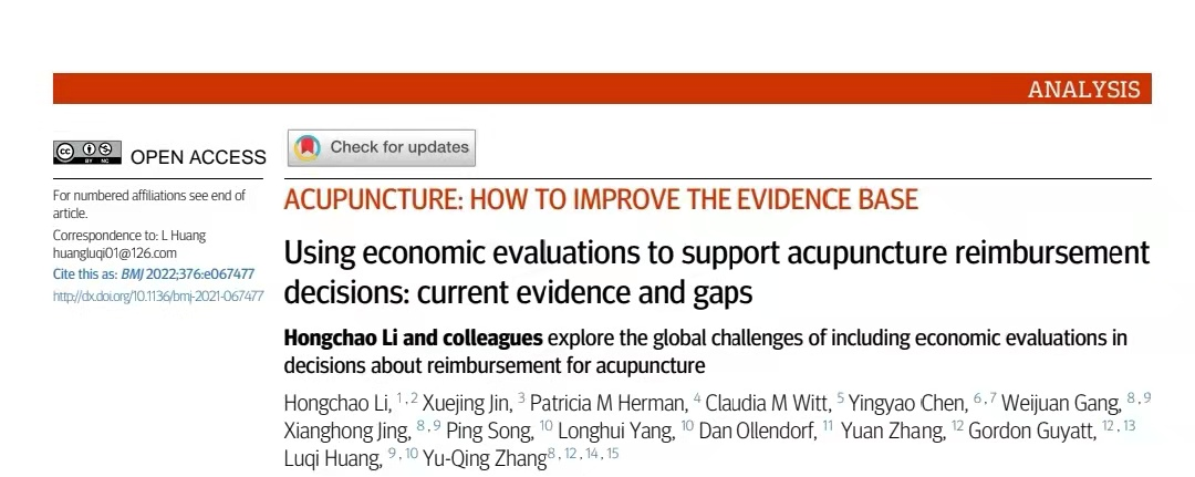 近日,我校國(guó)際醫(yī)藥商學(xué)院李洪超副教授以第一作者在British Medical Journal(BMJ,IF=39.89)發(fā)表分析性文章(Analysis)《通過經(jīng)濟(jì)學(xué)評(píng)估支持針灸納入醫(yī)保報(bào)銷決策:現(xiàn)有證據(jù)及研究缺口》。該文章的通訊作者是中國(guó)工程院院士、中國(guó)中醫(yī)科學(xué)院院長(zhǎng)黃璐琦教授,合作者包括來自北京中醫(yī)藥大學(xué)、加拿大麥克馬斯特大學(xué)、上海復(fù)旦大學(xué)、中國(guó)中醫(yī)科學(xué)院、瑞士蘇黎世大學(xué)、美國(guó)塔夫茨醫(yī)療中心以及美國(guó)RAND公司的相關(guān)學(xué)者。