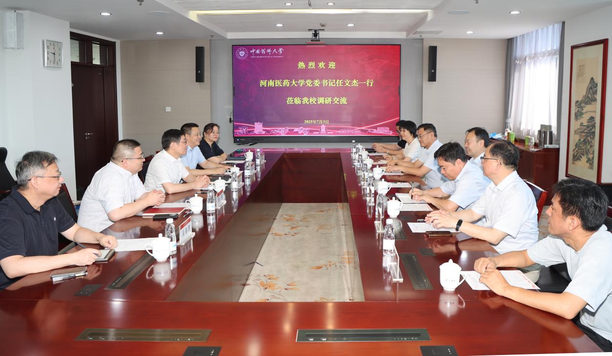 7月3日,河南醫藥大學黨委書記任文杰一行來我校調研交流。校黨委書記戴建君出席座談會,河南醫藥大學副校長王天云、姬廣軍,學術副校長華子春,我校黨委常委、副校長姚和權及相關職能部門和學院負責同志參加座談會。