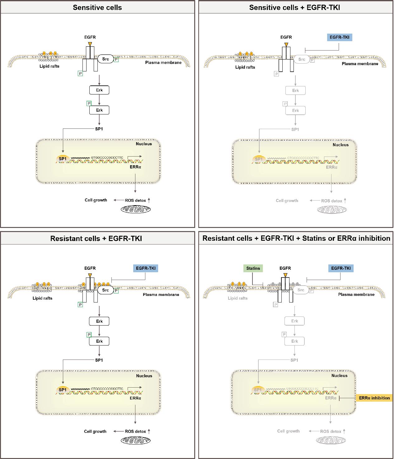 研究發現,膽固醇水平升高是存在于吉非替尼和奧希替尼耐藥細胞的普遍現象,并且升高的膽固醇在脂質筏累積,能夠通過激活EGFR/ Src/Erk信號軸介導轉錄因子SP1發生核轉位,SP1直接與雌激素相關受體α(ERRα)啟動子結合,使其在EGFR-TKIs存在的情況下發生轉錄,進而產生EGFR-TKIs的獲得性耐藥。該研究結果表明膽固醇/EGFR/Src/Erk/SP1軸介導的ERRα表達促進了EGFR-TKIs耐藥癌細胞的存活。此外,該研究還證明了降低膽固醇和下調 ERRα 有望成為 NSCLC 的有效輔助治療手段。