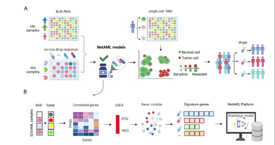 急性髓系白血病(AML)是一種起源于骨髓造血干細胞的惡性克隆性疾病,患者對現有治療方案的反應差異巨大,亟需針對病人個體差異來制定精準的用藥方案。然而,腫瘤細胞的異質性使得尋找可靠的預測性生物標志物異常困難。傳統的基于bulk RNA-Seq和體外實驗的模型,往往難以捕捉隱藏在治療反應和耐藥性背后的復雜分子通路與基因網絡。為此,研究團隊開發了名為 NetAML 的網絡驅動精準藥物敏感性預測平臺。這項研究主要有以下關鍵發現: