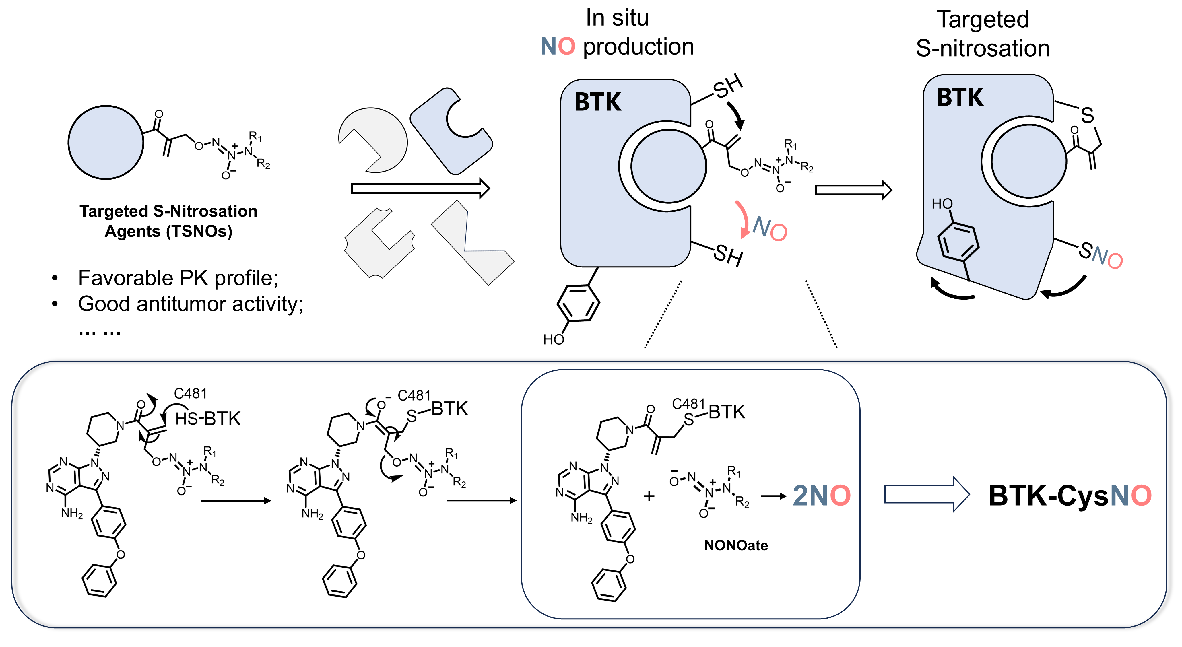 針對上述關鍵科學問題,團隊利用共價抑制劑策略,設計、合成了一系列NO釋放型彈頭,并將其分別搭載在靶向激酶BTK、FGFR4和HER2的小分子配體母核上,使得靶蛋白特定巰基與彈頭發生共價結合的同時能夠釋放NO,NO在極小范圍內分布并對靶蛋白自身產生選擇性亞硝化修飾。結果表明,選擇性亞硝化調控劑TSNO1-8具有較優的體外穩定性、良好的藥代性質、較優的激酶譜選擇性以及較優的體內外抗淋巴瘤活性。進一步的亞硝化組學研究表明,選擇性亞硝化調控劑TSNO1在體內、體外均能對BTK的Cys527產生選擇性亞硝化修飾,此位點的亞硝化修飾破壞了BTK激酶結構域構象,使得Tyr551被氫鍵包埋,進一步影響了BTK的激酶信號轉導。綜上所述,本研究不僅為選擇性亞硝化調控提供了新方法,也為選擇性翻譯后修飾藥物開發提供了新思路。