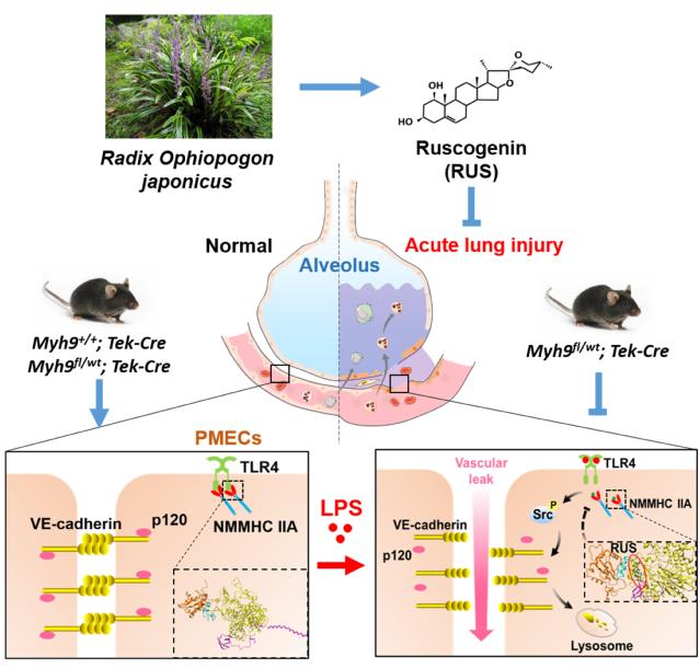 中藥麥冬具有養陰生津,潤肺清心的功效。其有效活性成分魯斯可皂苷元(RUS)具有顯著的抗炎、抗血栓、保護血管內皮等藥理作用。寇俊萍教授團隊證實,RUS具有改善LPS誘導的肺內皮屏障功能障礙進而保護急性肺損傷的功能。該研究以RUS為分子探針識別出分子馬達蛋白—非肌肉肌球蛋白重鏈IIA(NMMHC IIA)為其特異性結合蛋白,證實NMMHC IIA在LPS誘導的小鼠肺血管內皮中表達增高,內皮NMMHC IIA等位基因缺失可明顯抑制小鼠肺損傷;并發現RUS主要通過與NMMHC IIA 的N端和頭部功能區結合,抑制NMMHC IIA與TLR4的解離,抑制LPS誘導的TLR4下游Src信號通路的激活及黏附連接蛋白VE-cadherin的降解進而改善肺損傷。該研究豐富了急性肺損傷的病理機制,揭示了中藥活性成分RUS防治急性肺損傷的作用靶點,為臨床防治急性肺損傷以及內皮屏障功能障礙相關疾病提供潛在新靶點和可能的候選藥物,也為闡釋中藥麥冬滋陰潤肺的科學內涵提供藥理學依據,為探索中藥藥理原創機制提供了思路和方法借鑒。
