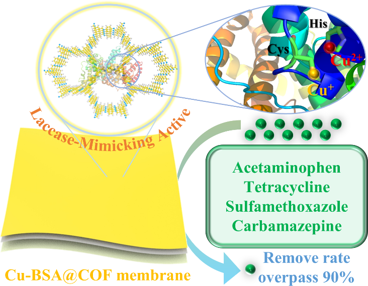 為解決上述問題,研究團隊基于“原位”和“受限配位”的概念設計了一種具有顯著漆酶模擬活性的無機–有機雜化共價有機框架(Cu-BSA@COF)。牛血清白蛋白(BSA)與銅(Cu)的配位結合促進了多銅活性中心的形成(圖1)。COF的骨架和孔隙結構保護活性位點并增強底物吸附。它們之間的協同作用確保材料在各種惡劣操作條件下保持催化活性。研究表明Cu-BSA@COF具有和天然漆酶相接近的底物親和力(Km)和生物催化效率(Kcat/Km)。與天然漆酶和Cu-BSA相比,其生物催化效率分別增加了18.56%和168.57%,結果表明Cu-BSA@COF是天然漆酶的理想替代品。基于上述優勢,研究團隊成功將其與膜技術結合,在最佳工藝和應用條件下,該膜一次過濾可去除90%以上的鹽酸四環素(TC)、對乙酰氨基酚(APAP)、卡馬西平(CBZ)和磺胺甲惡唑(SMZ)(環境中藥物污染物的主要成分)(圖2)。廣泛的適用性和有效規避對環境的次生污染風險為藥物污染物的去除提供了研究新范式。