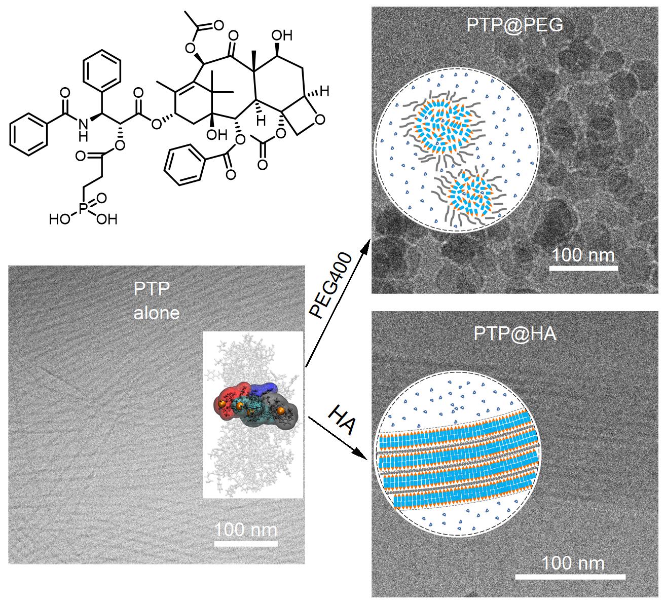 圍繞這一命題,劉東飛教授團隊以紫杉醇這一結構復雜、抗腫瘤活性顯著的天然產物為模型,探索氫鍵驅動的形貌可編程裝配。團隊設計合成兩親性紫杉醇磷酸化衍生物(PTP),通過引入親水性磷酸基團增強氫鍵作用,自組裝形成納米纖維;進一步與聚乙二醇400(PEG400)或透明質酸(HA)共組裝,可分別獲得球形納米顆粒(PTP@PEG)與纖維束(PTP@HA),實現按需的遞送功能分配。在4T1乳腺癌小鼠中,靜脈給藥的PTP@PEG顯著延長體循環、降低腎臟蓄積并增強抗腫瘤效應;在結直腸癌腹膜轉移模型中,腹腔給藥的PTP@HA呈現持續釋放并取得良好療效。該研究系統展示了利用氫鍵調控實現藥物組裝形貌的精準控制,為單一藥物跨疾病場景的有效遞送提供了通用思路。