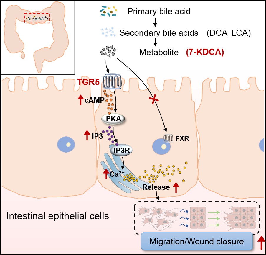 研究團隊通過系統篩選發現,UC患者與結腸炎模型小鼠血清中多種膽汁酸水平顯著降低,以7-酮脫氧膽酸(7-KDCA)的下調最為顯著,且其含量與疾病嚴重程度呈負相關。在多種膽汁酸中,7-KDCA表現出最強的促黏膜修復作用,而外源性補充7-KDCA可顯著加速DSS誘導與活檢所致腸損傷模型小鼠的結腸黏膜愈合。機制研究表明,7-KDCA并非通過傳統的抗炎免疫途徑發揮作用,而是直接作用于腸上皮細胞,通過激活TGR5-IP3R信號軸,誘導內質網鈣釋放,從而增強上皮細胞的遷移能力,驅動傷口閉合,該發現為黏膜修復治療提供了新靶點與理論依據。中藥學院博士研究生章靜為本論文的第一作者,戴岳教授和夏玉鳳教授為共同通訊作者。
