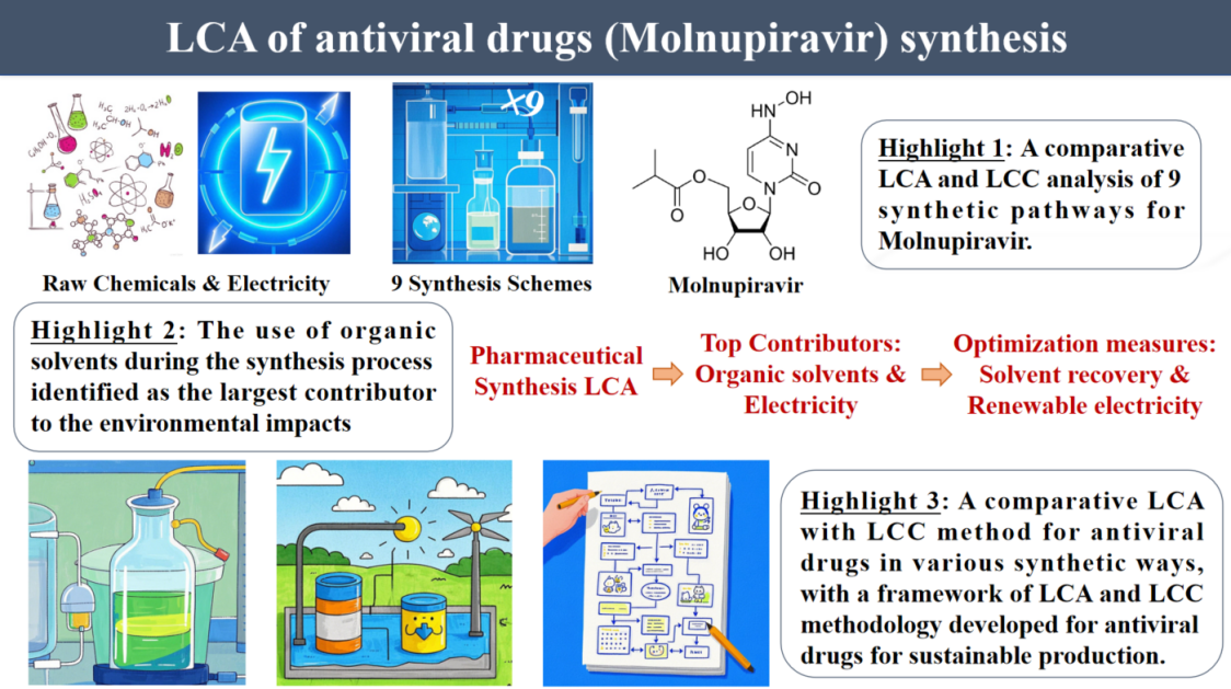 近日,工學(xué)院黃德春/董斌團(tuán)隊(duì)針對醫(yī)藥工業(yè)可持續(xù)發(fā)展及雙碳問題,聯(lián)合荷蘭萊頓大學(xué)、英國帝國理工大學(xué)、美國紐約大學(xué)及加利福尼亞大學(xué)洛杉磯分校(UCLA)等高校專家,在全球頂尖綜合性期刊PNAS(美國國家科學(xué)院院刊)發(fā)表研究性論文“Divergent Sustainability Profiles of Molnupiravir Synthesis Routes Are Governed by Solvent Use and Process Design”。該論文提出了創(chuàng)新性藥物可持續(xù)生產(chǎn)框架,通過整合生命周期評估(LCA)與生命周期成本分析(LCC),首次系統(tǒng)量化廣譜抗病毒藥物莫努匹韋(Molnupiravir)的九種合成路線的碳足跡與經(jīng)濟(jì)性能,進(jìn)而評估其可持續(xù)發(fā)展及雙碳影響。董斌副教授、荷蘭萊頓大學(xué)Justin Lian研究員與Stefano Cucurachi教授為共同通訊作者,我校2022級碩士生陳正昀為第一作者,中國藥科大學(xué)為第一通訊單位。